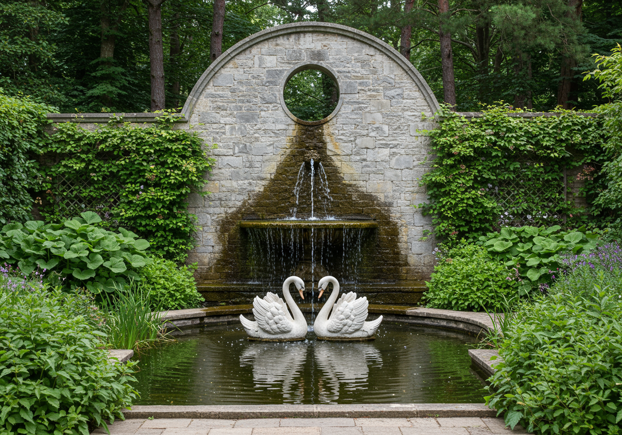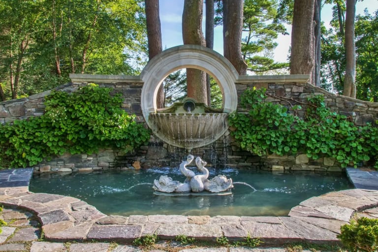 Lush flower-rich gardens follow the slope of the hillside from the panoramic backdoors towards acres of meadows and woods. And, most importantly, hearkening back to yesteryear is a picturesque fountain and quiet stone pool. Water flows from its central, circular arch into a chalice-like receptacle—then, from there, is channeled in rivulets down grooved contours to sound a patter as refreshing as summer rain. It imbues the site with a meditative, almost mystical quality.