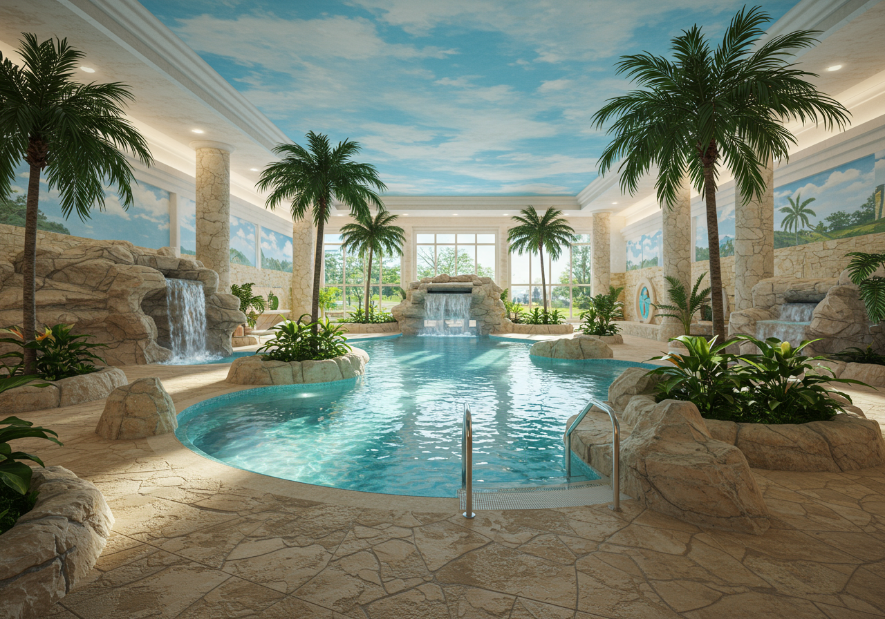 Whatever the season, the indoor pool with water features provides a portal to perpetual summer, with fanning palm trees and colorful tropical flowers offering a floral counterpoint to the surrounding eponymous evergreens for which the area is named. In this otherworldly oasis, waterfalls cascade from craggy outcroppings, while the stunningly crafted ceiling is a canopy of azure sky.