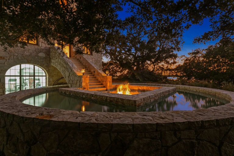 But what this home accomplishes with water is exceptional on multiple levels—literally, since the modern lap pool descends in a terraced waterfall, while well-placed fountains enhance the stateliness of the exterior. There’s also a smaller, spa-like pool with a delicate curtain of therapeutic spray and an unobstructed view of the 200-inch outdoor television. With their structural ingenuity, the water features here lend a whole new meaning to “top tier.”
