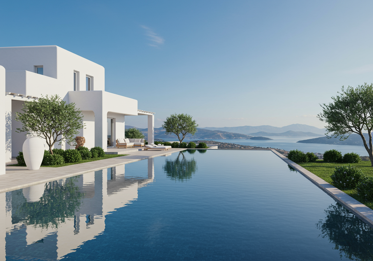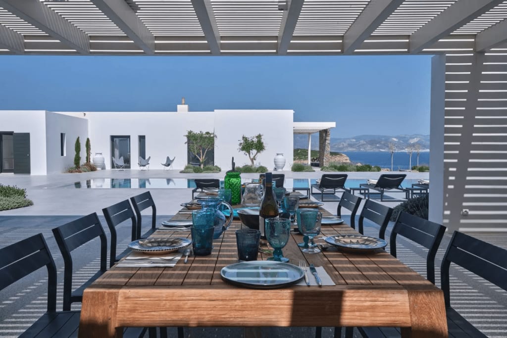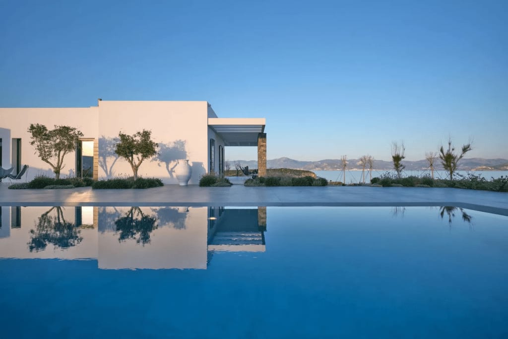 “Sea Melody,” a magnificent property on Paros, is in the middle of this stunning scenery. The flat, geometric contours of the home are tastefully contiguous with the low-lying islands in its vicinity, and the sprawling 49-foot pool mirrors the azure skies and brings the water right to the center of the residence.