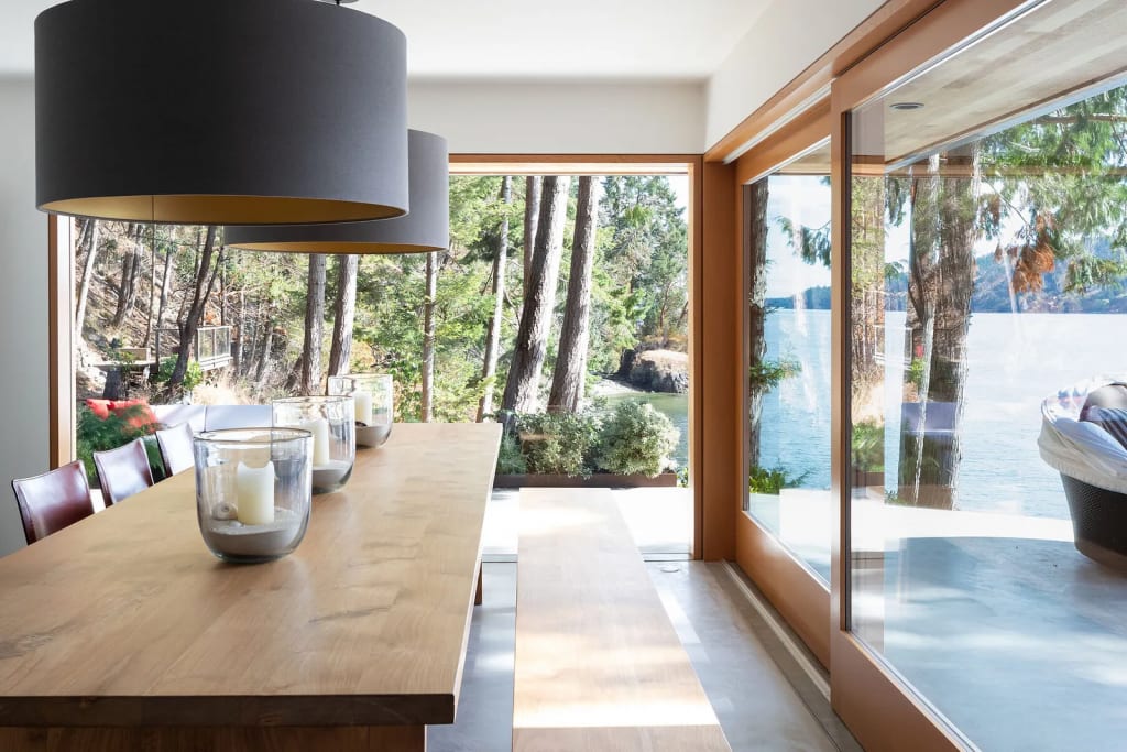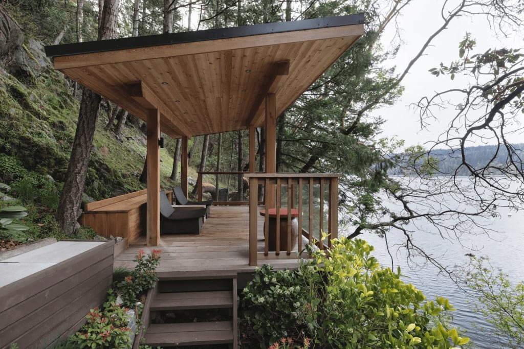 With bright wooden architecture that accentuates the madrone trees growing along the rugged shoreline, as well as entire walls of glass, the aptly named “Light House” makes the most of its splendid location. The combination of panoramic windows and connected sundecks, gardens, patios, and pathways provide ideal indoor-outdoor living spaces set in harmony with the landscape.