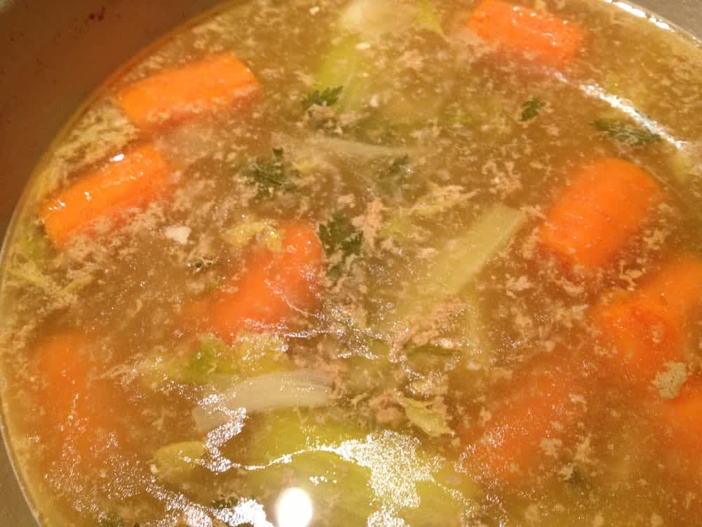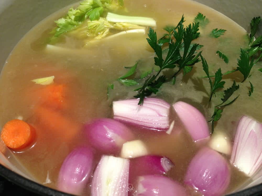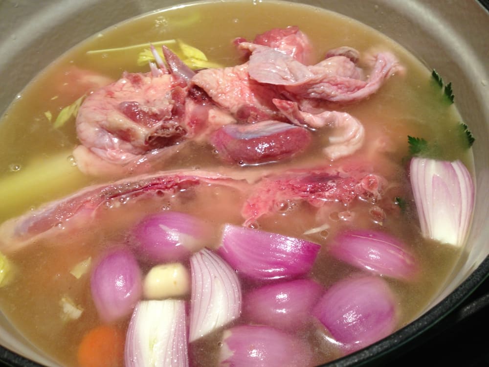 - In a large saucepan, combine low-salt chicken broth, carrots, celery, onion, parsley stems, and reserved turkey neck, heart, and gizzard. Bring to a boil.