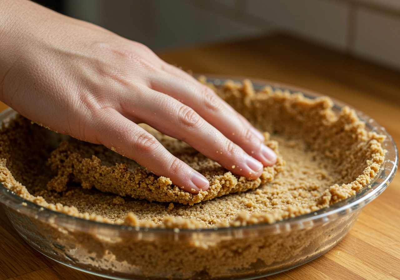 - Press the crumb into and along the sides and bottom of a 9″ pie pan to form an even layer, place in the fridge to set until filling is ready.