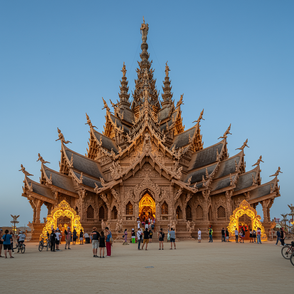 This year the name given to the temple was, “Temple of Juno”. It was made up of a large central tower with a central altar space, sitting within a 150′ x 150′ walled courtyard lined with benches and accessed from four entrances. Intricately cut wooden panels and detailed shapes covered the courtyard walls as well as the interior space and altars, all filled with penned messages from burners offering intimate thoughts to be inevitably destroyed by the burn.
