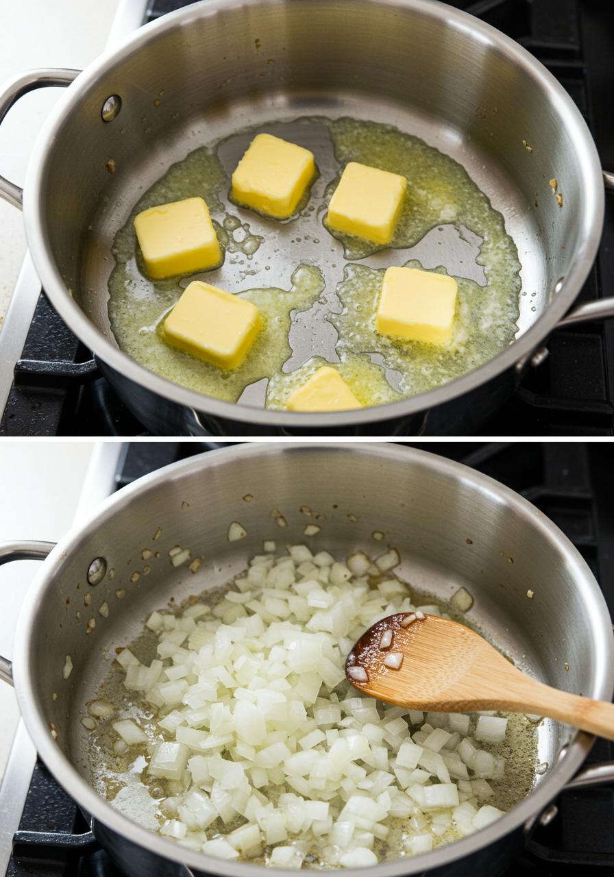 Drop butter into large saucepan and melt. Add in onions and saute until translucent. Add garlic, saute until lightly brown. Add grated ginger, carrots and veggie broth, simmer until carrots are tender.