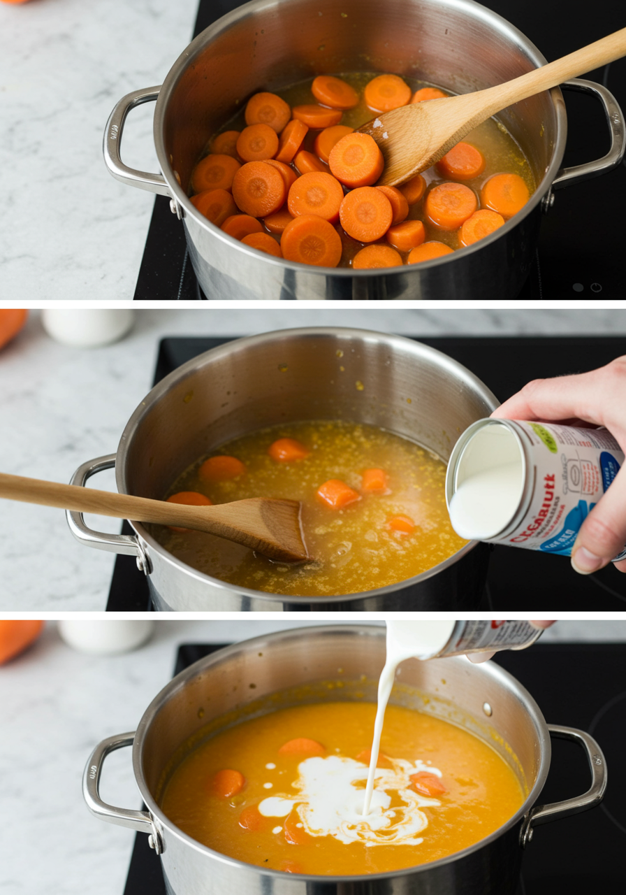 Add grated ginger, carrots and veggie broth, simmer until carrots are tender.