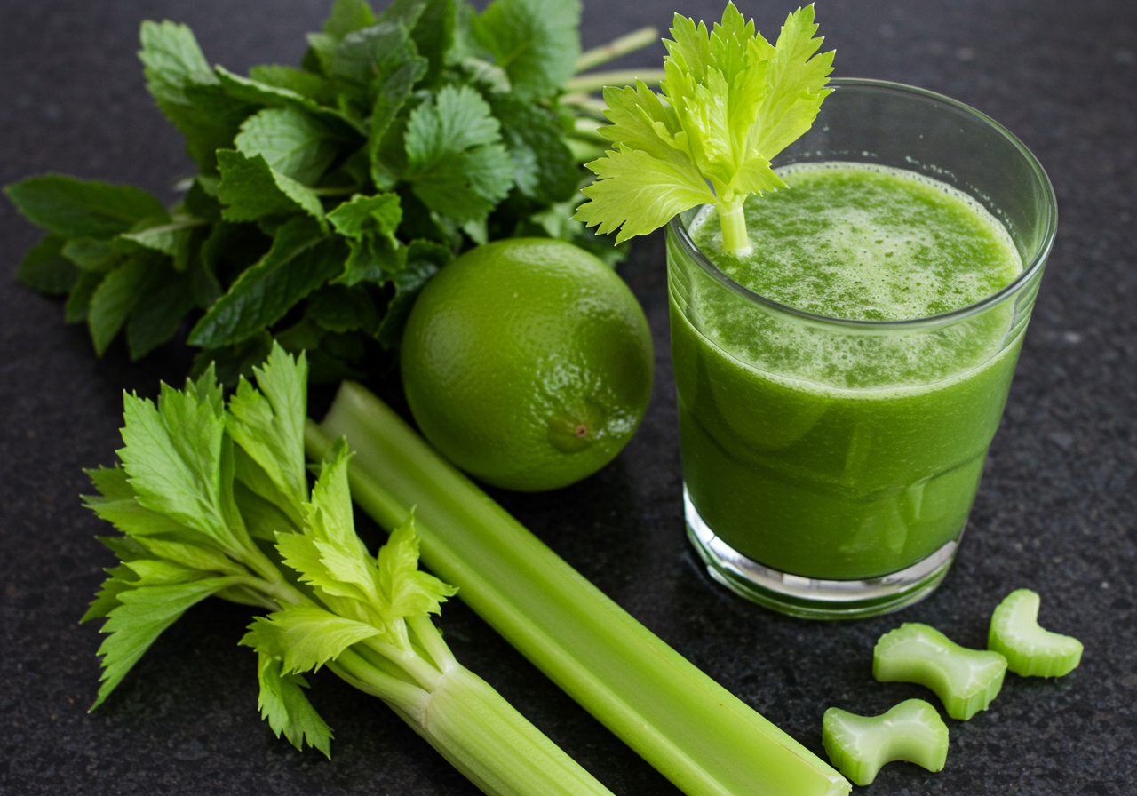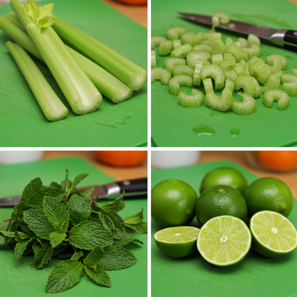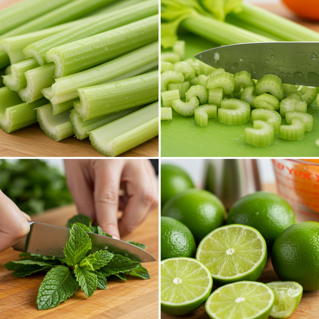- Using a fresh crunchy stalk of celery, chop 1 cup of celery and set aside. Remove the celery leaves from the stalk and set aside for garnish. Separate the mint sprigs and set aside. Juice the limes and set aside 1 oz.