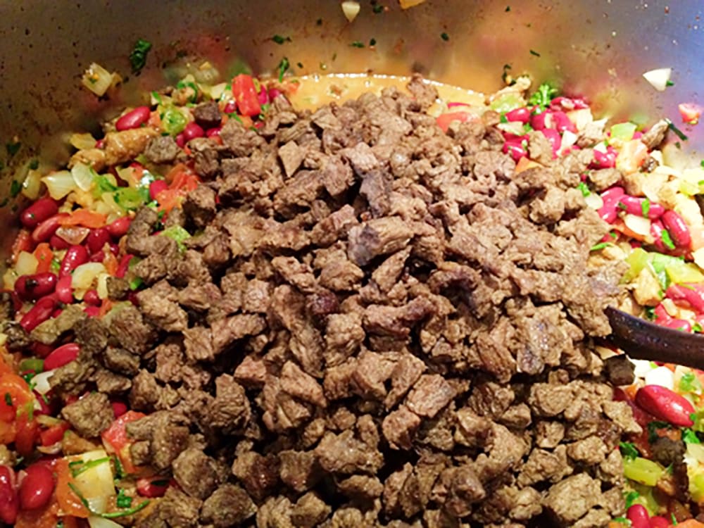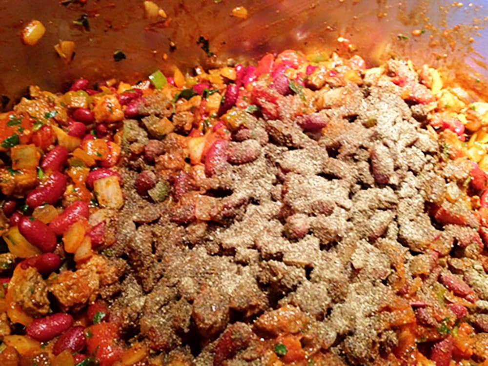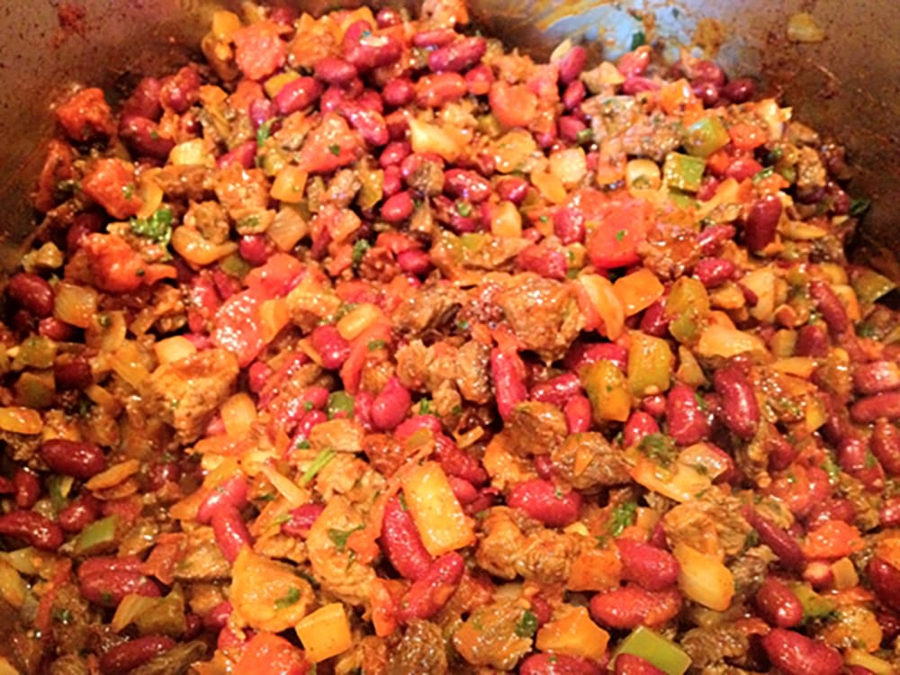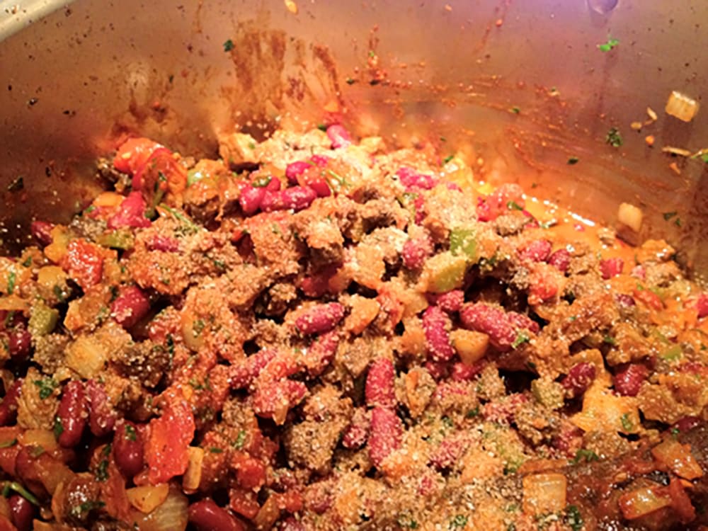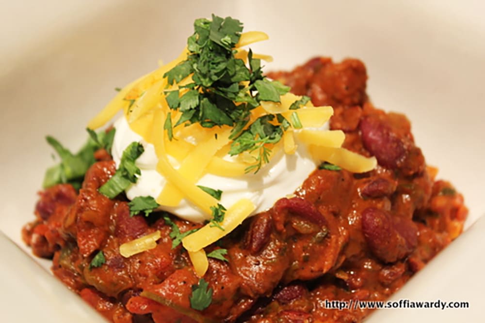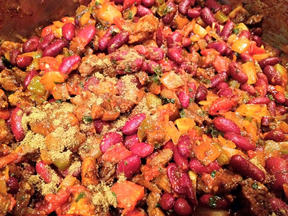 Bring mixture to a boil. Reduce heat. Simmer, covered, for one hour. Uncover and cook 30 minutes more, or to desired consistency. Chili shouldn’t be too thick – if need be, do add some water. It should be somewhat liquid, but not runny like soup. Skim off excess fat and serve.