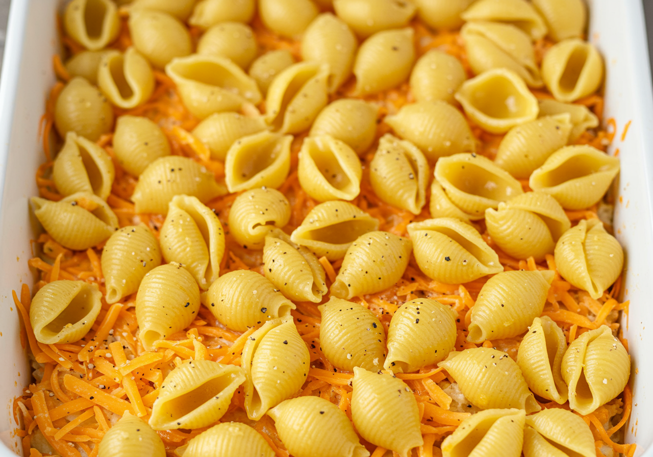 - Place a single layer of pasta in the baker, top with a layer of cheese. Repeat the layers, ending with cheese.