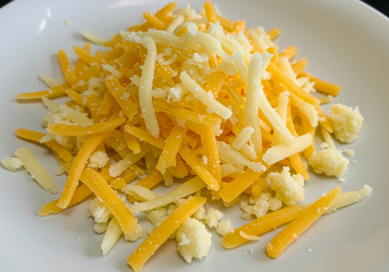 If you prefer yellow cheddar to white, use 2-8oz blocks of Tillamook sharp cheddar and 2 of medium cheddar instead of the 2-7oz blocks of Kerrygold white cheddar.