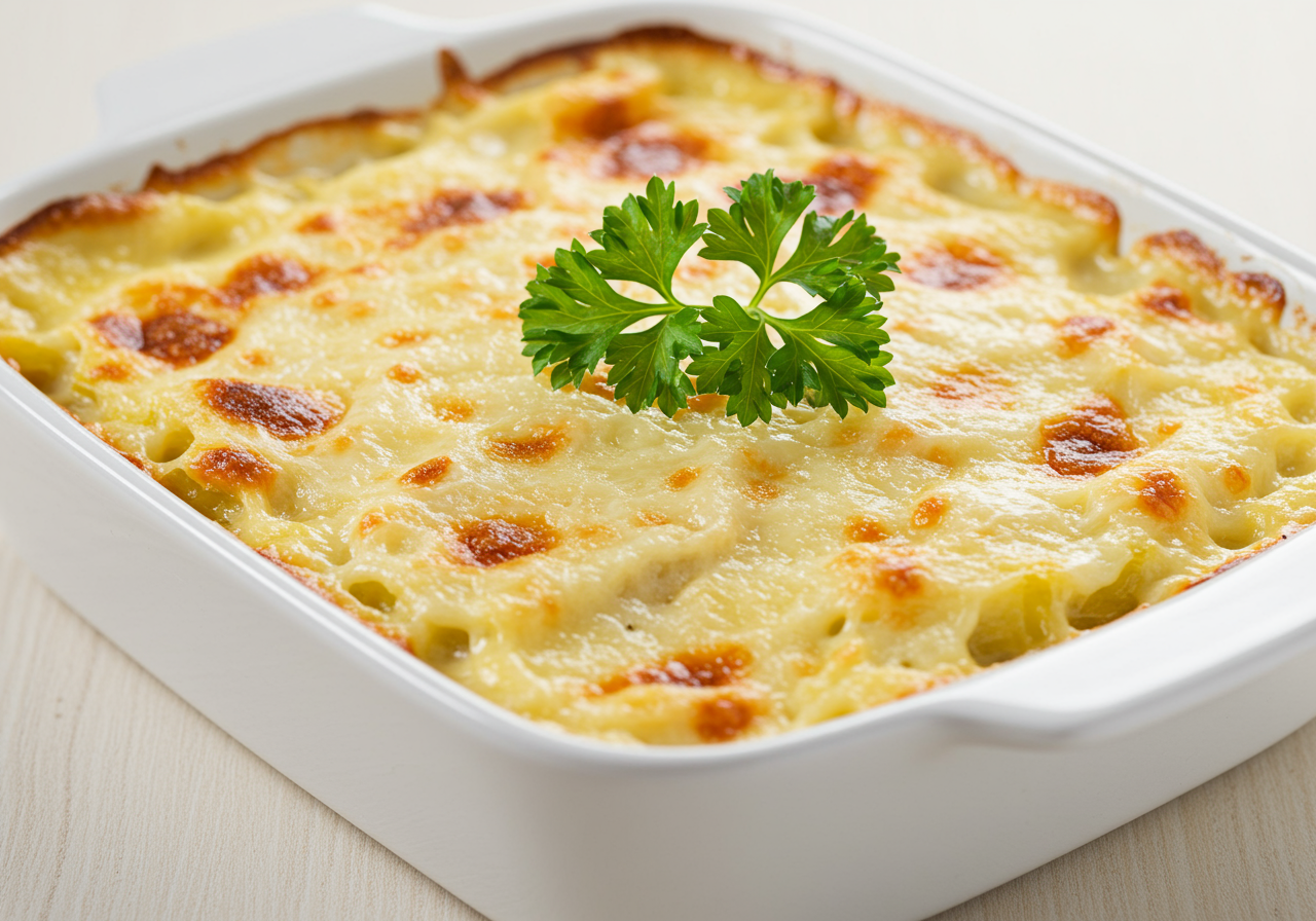 Dish can be made and refrigerated a day ahead and baked just before serving. You may also use smaller and or individual, deeper bakers and increase the layers. This recipe appeals to children and adults but for a little extra kick layer in some crispy bacon, chopped roasted garlic or chopped jalapeño.