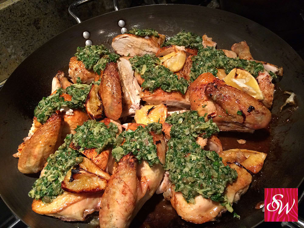 - Serve the chicken with the salsa verde and the roasted lemon.
