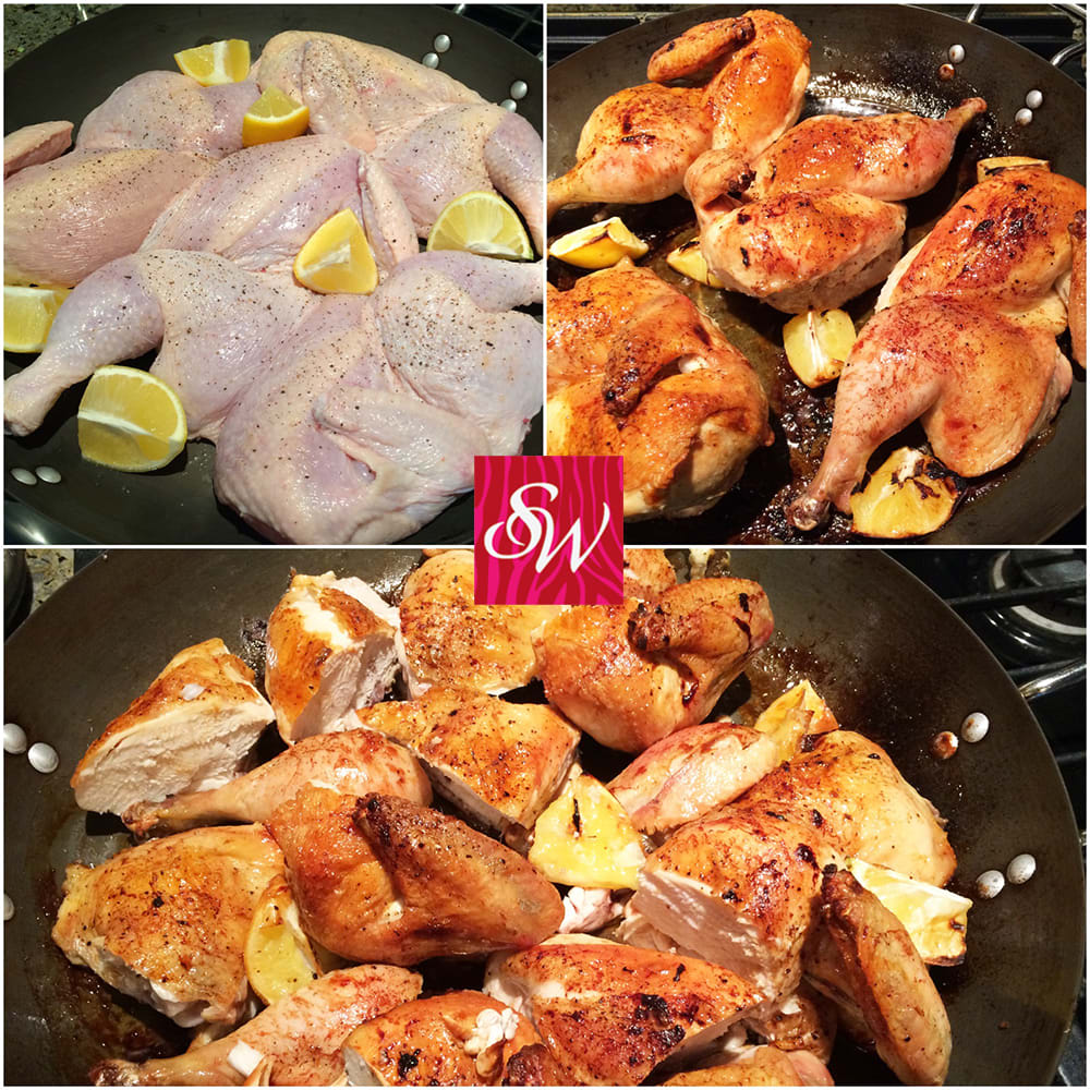 Preheat the oven to 450°. Using kitchen scissors, cut out the backbone. Flatten the chicken and pull out the breast bone, also known as spatchcocking. Check out our post on, How To Spatchcock A Chicken. Cut the chicken in half through the breast and season with sea salt and pepper. Set the chicken skin side up, in a roasting pan, drizzle with oil, and season skin side with sea salt and freshly cracked pepper; add the lemon halves to the pan and roast for 40 minutes, basting every 10 minutes, until just cooked through.