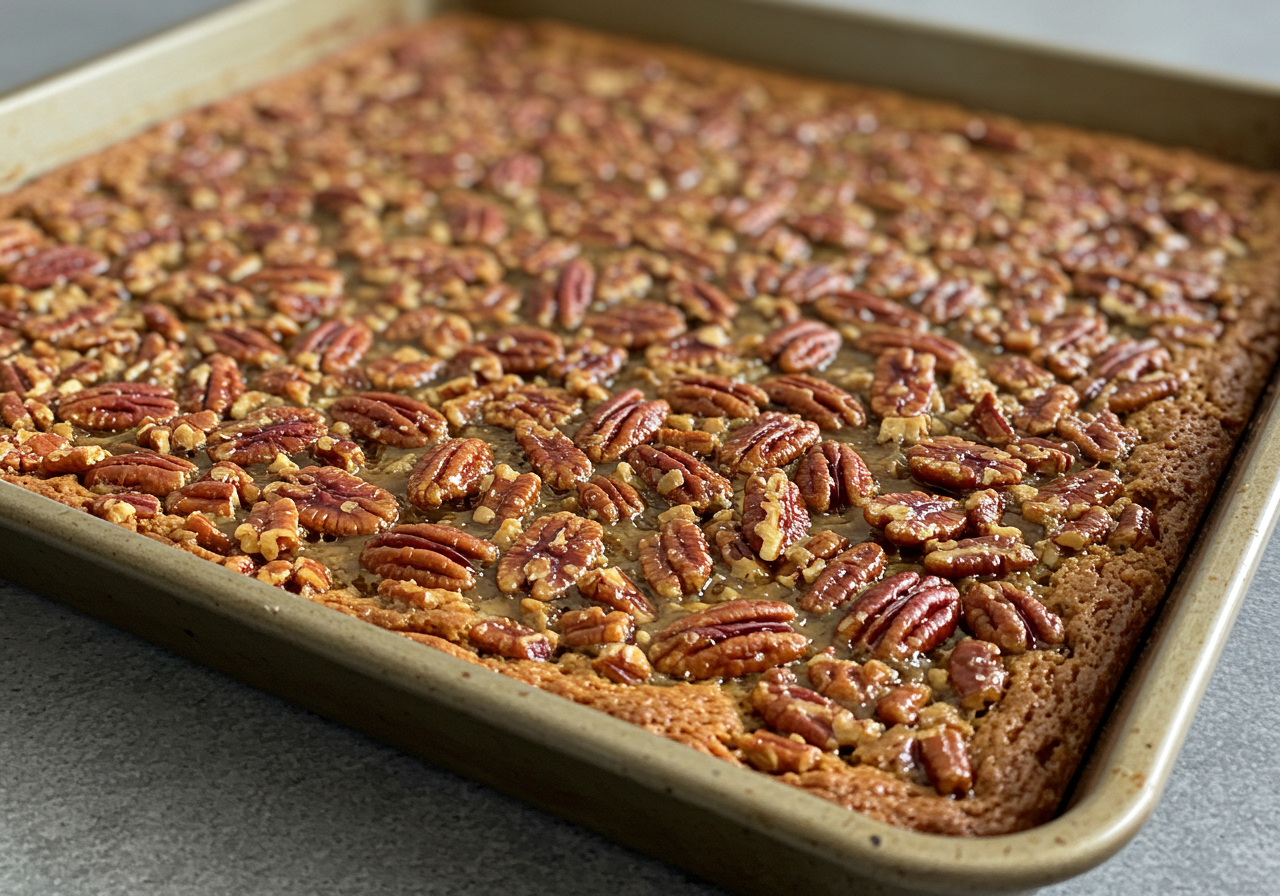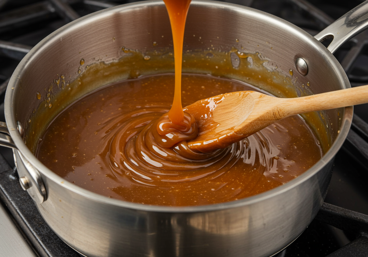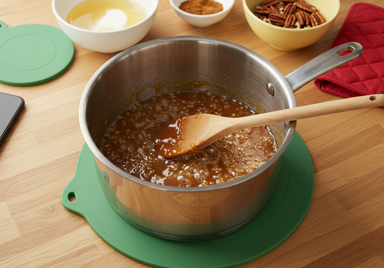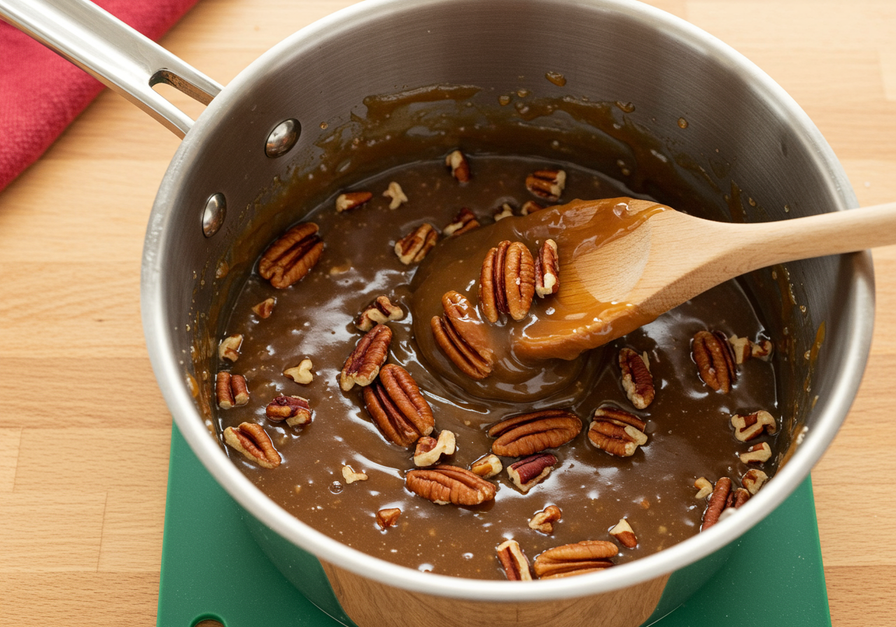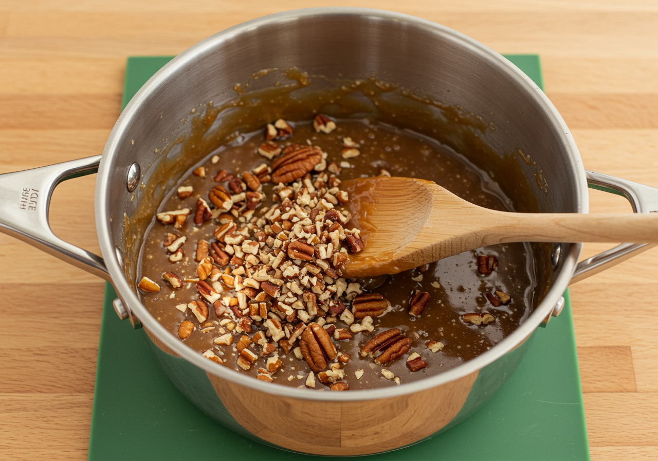 - Remove from the heat. Stir in the heavy cream and pecans.