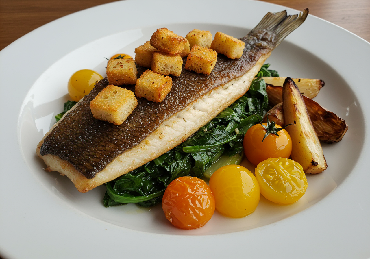 - Truite Meunière - whole Idaho trout, bloomsdale spinach, purple potato, sun gold tomato, capers, lemon