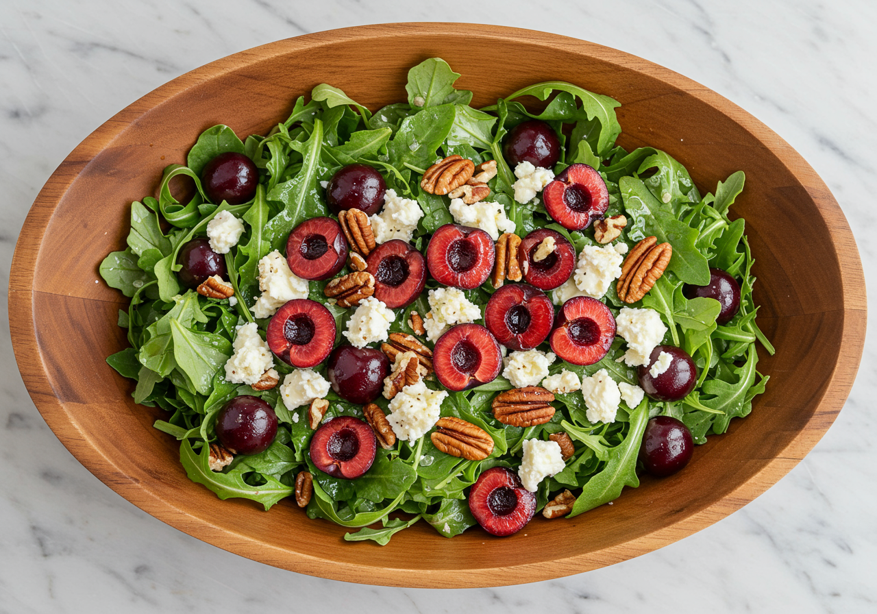 Layer all ingredients on top of the arugula, drizzle with the Cherry Vinaigrette, and lightly toss.