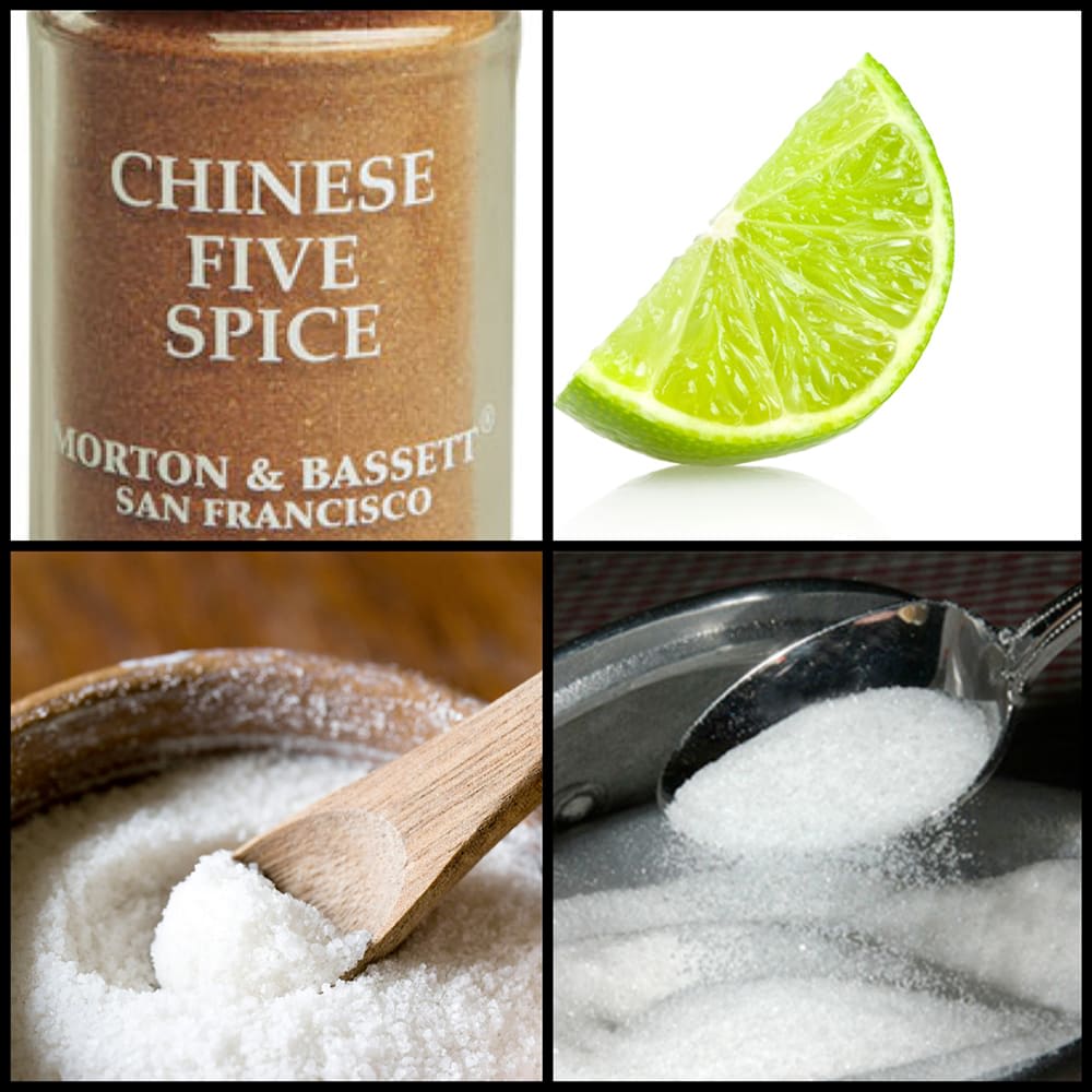 - Mix salt, sugar, and five-spice powder on a small plate. Rub rims of Old Fashioned glasses with lime wedge; dip in salt mixture and fill glasses with ice.