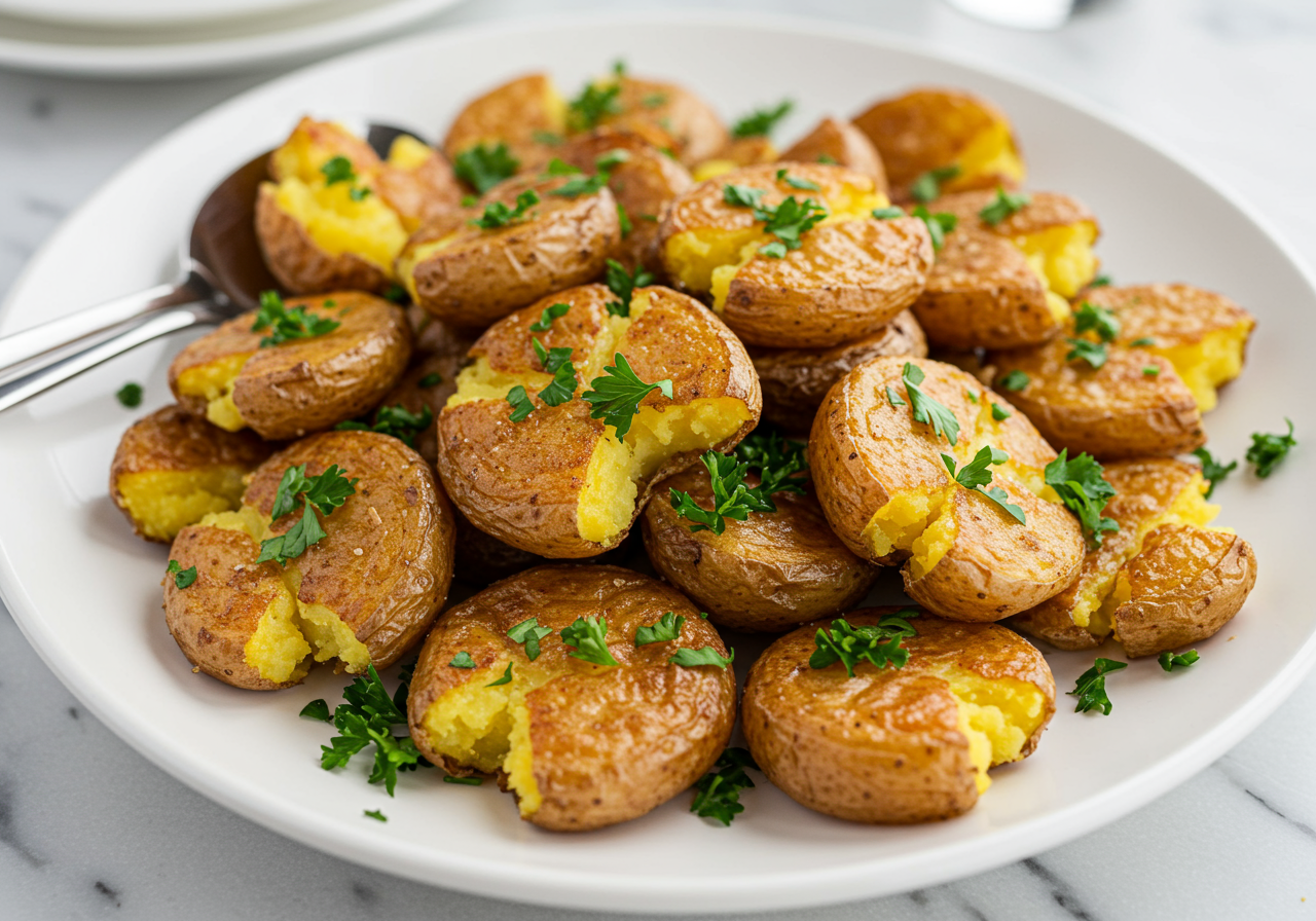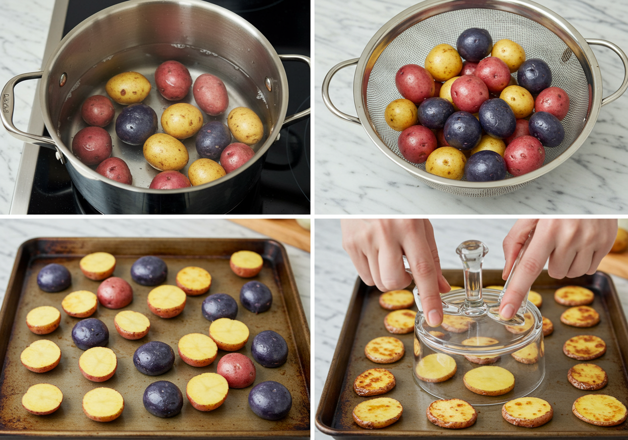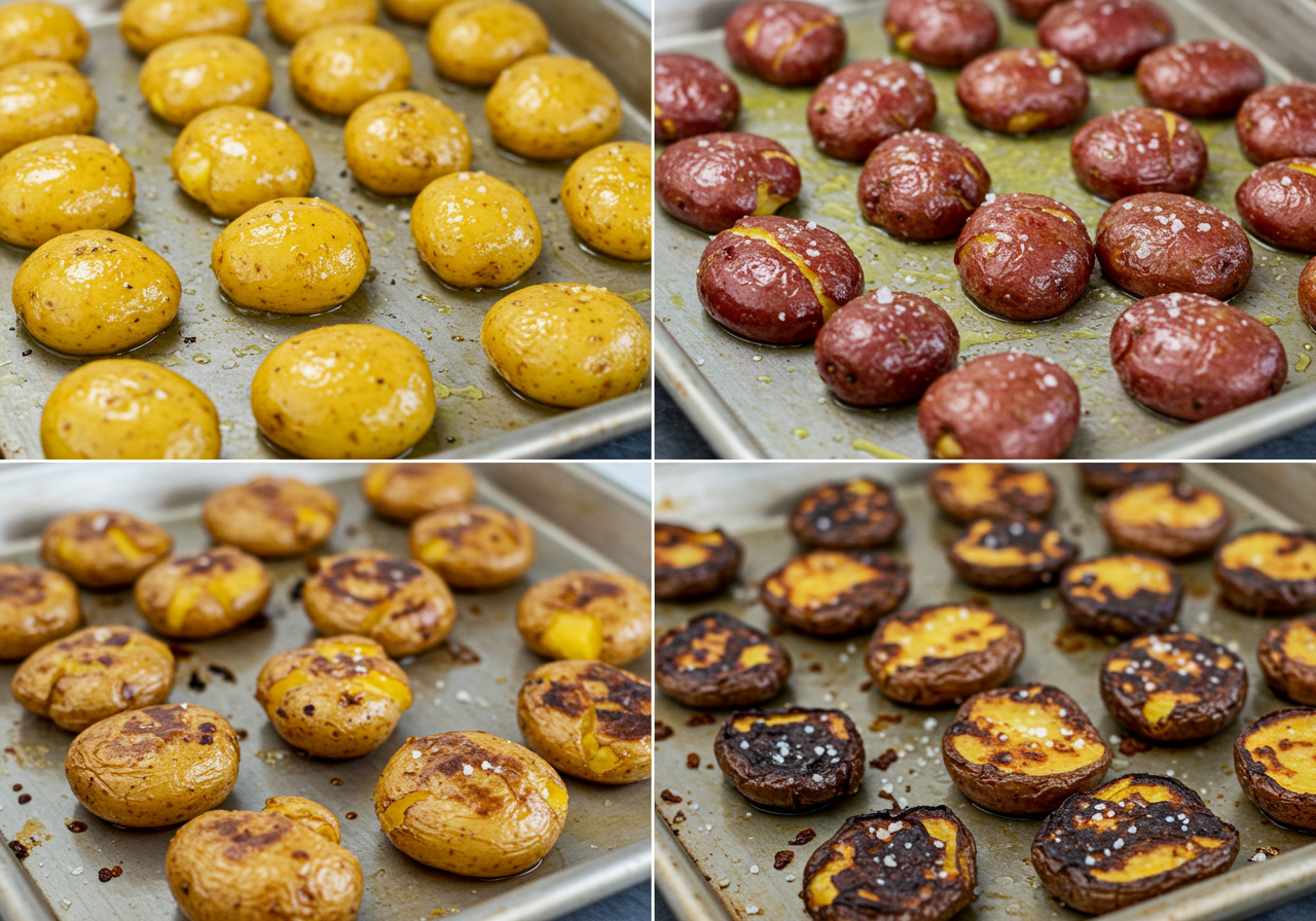 - In a medium pot, bring potatoes to a boil over high in salted water. Reduce heat and cook at a rapid simmer until potatoes are tender when pierced with a knife, about 20 minutes; drain. Place the potatoes on a flat surface. Using a flat surface (like the bottom of a glass), gently smash each potato so that it is flattened but still in one piece (edges will split).