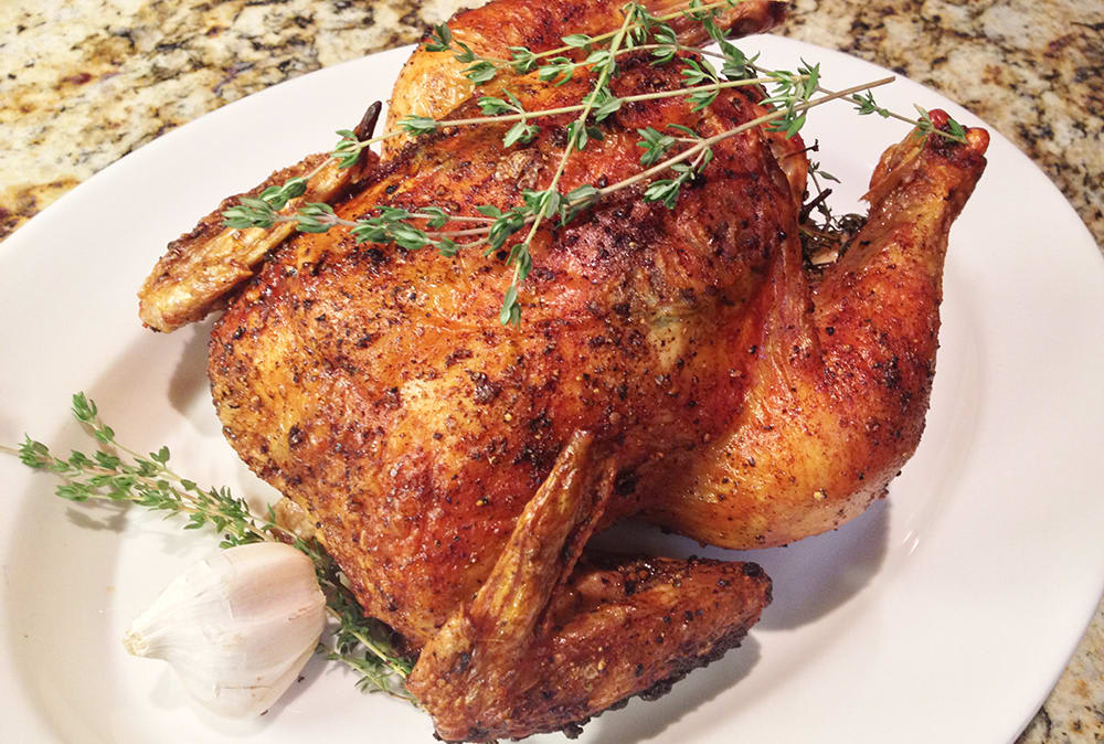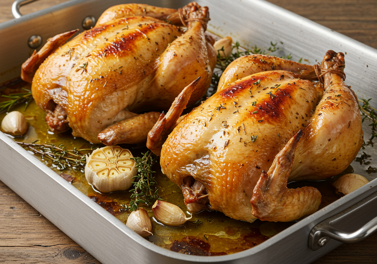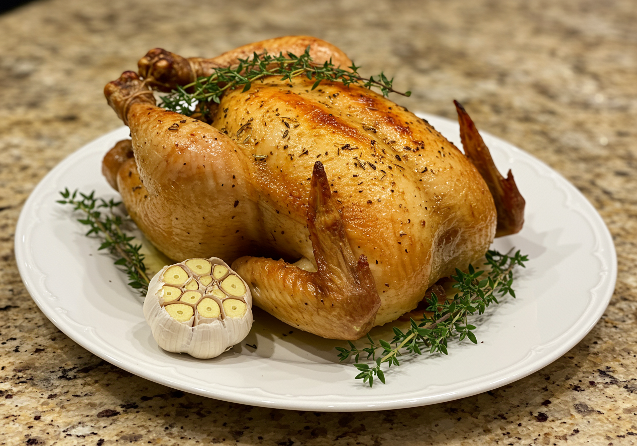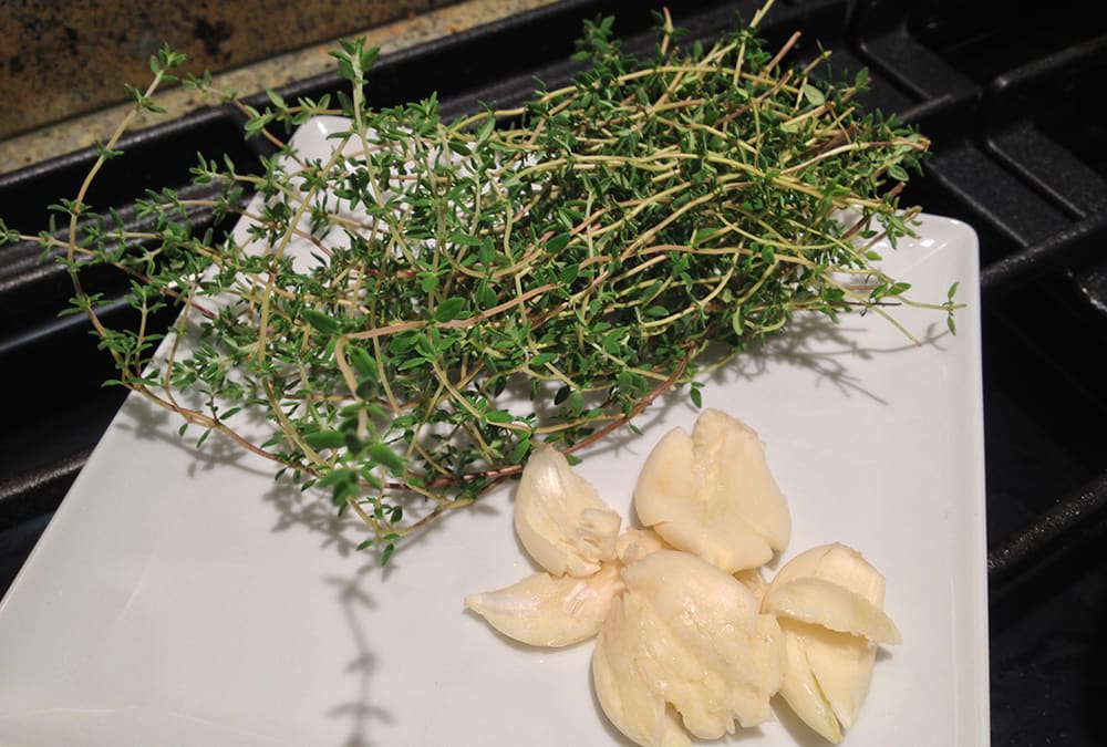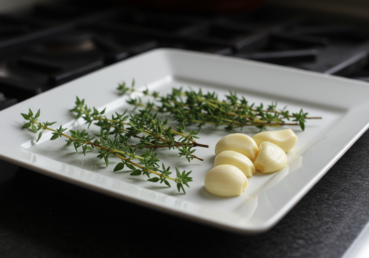 Season chicken with salt and pepper, stuff cavity with crushed garlic, and bunch thyme; tie legs together with kitchen twine. Transfer to a 9″ x 13″ baking dish.