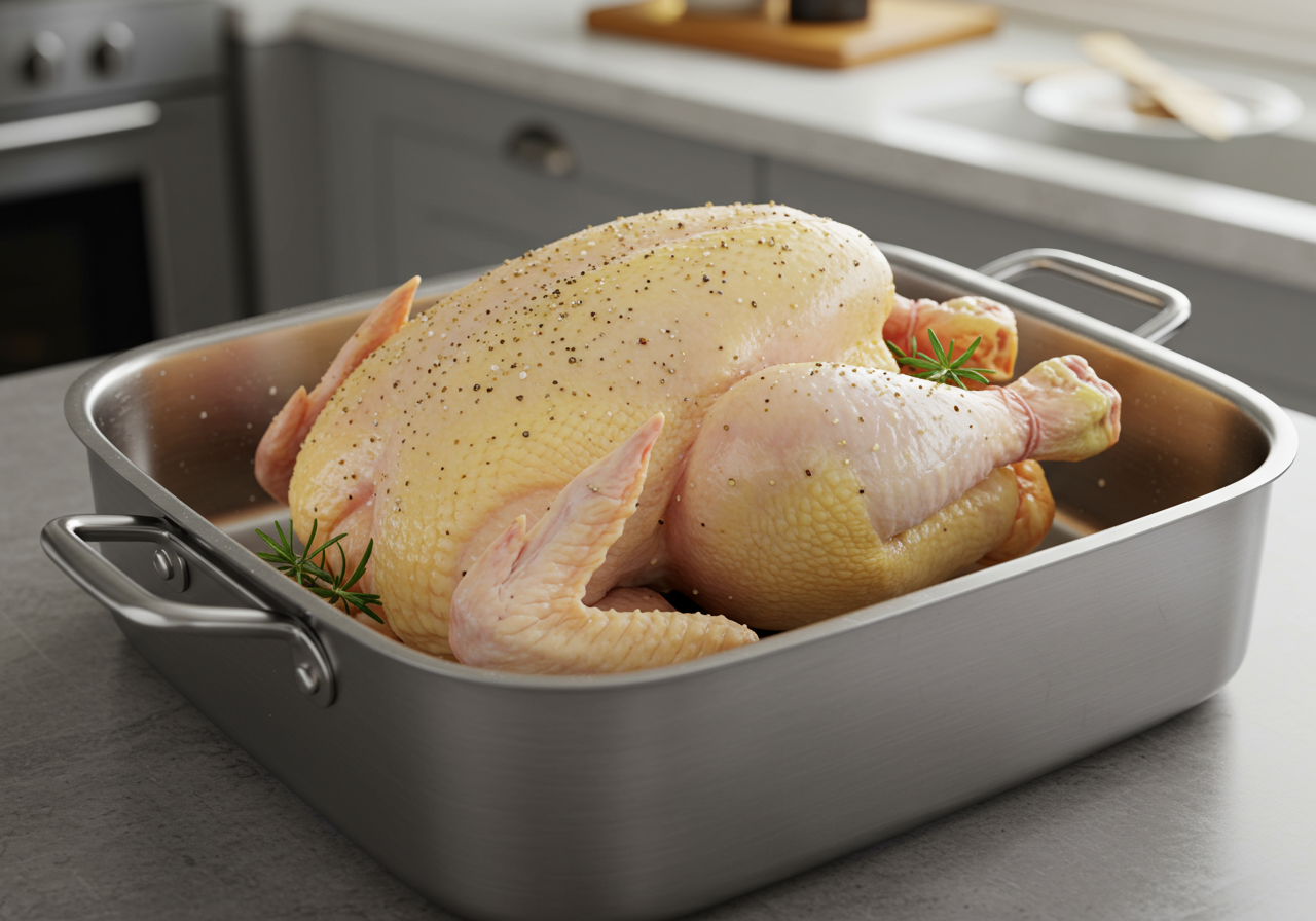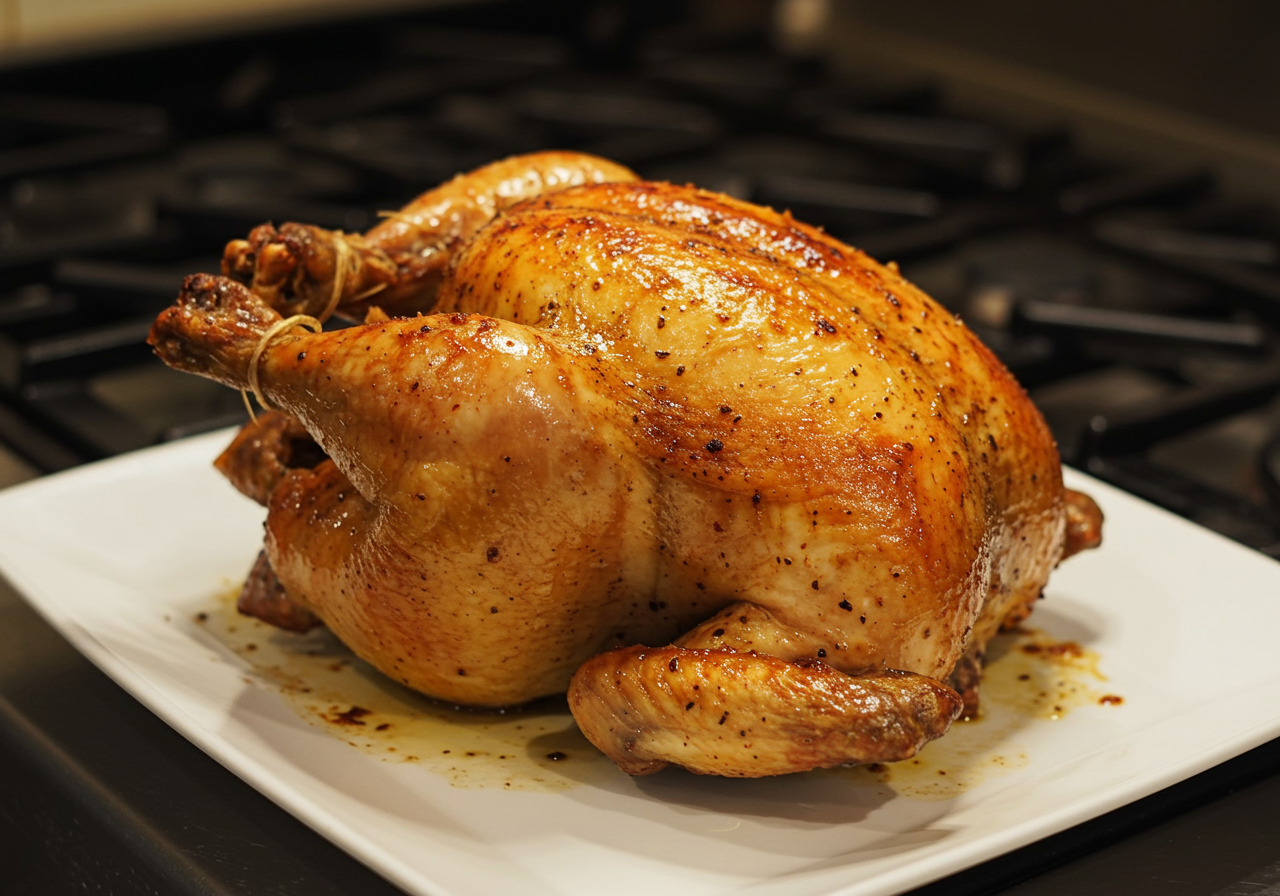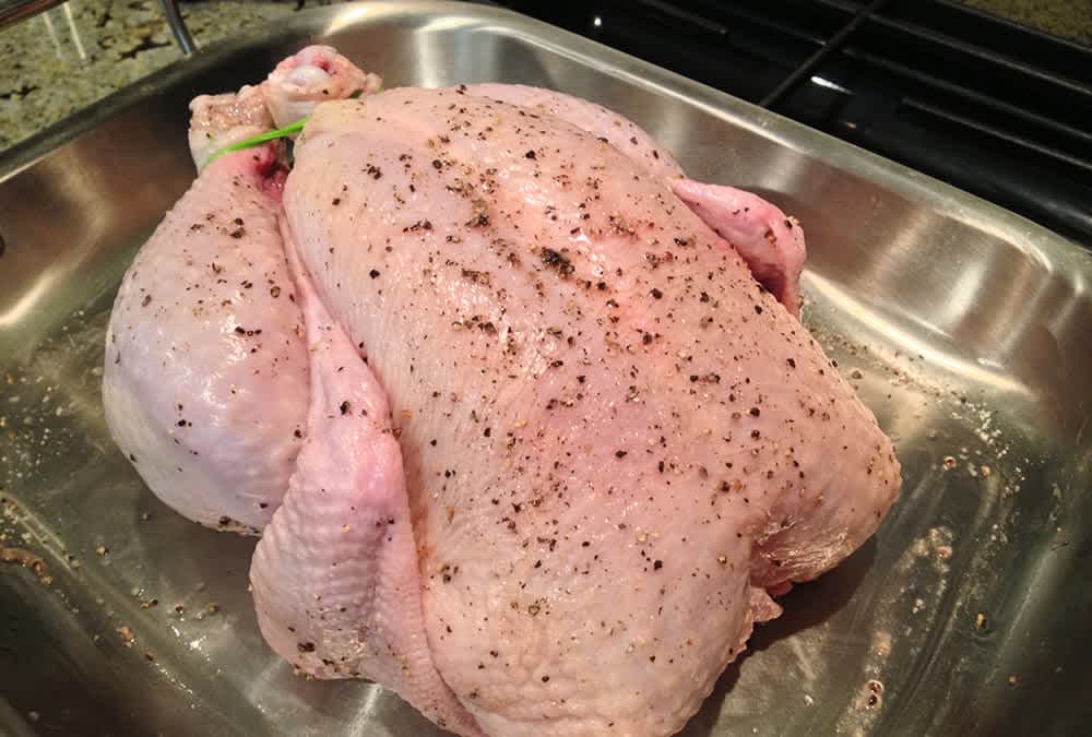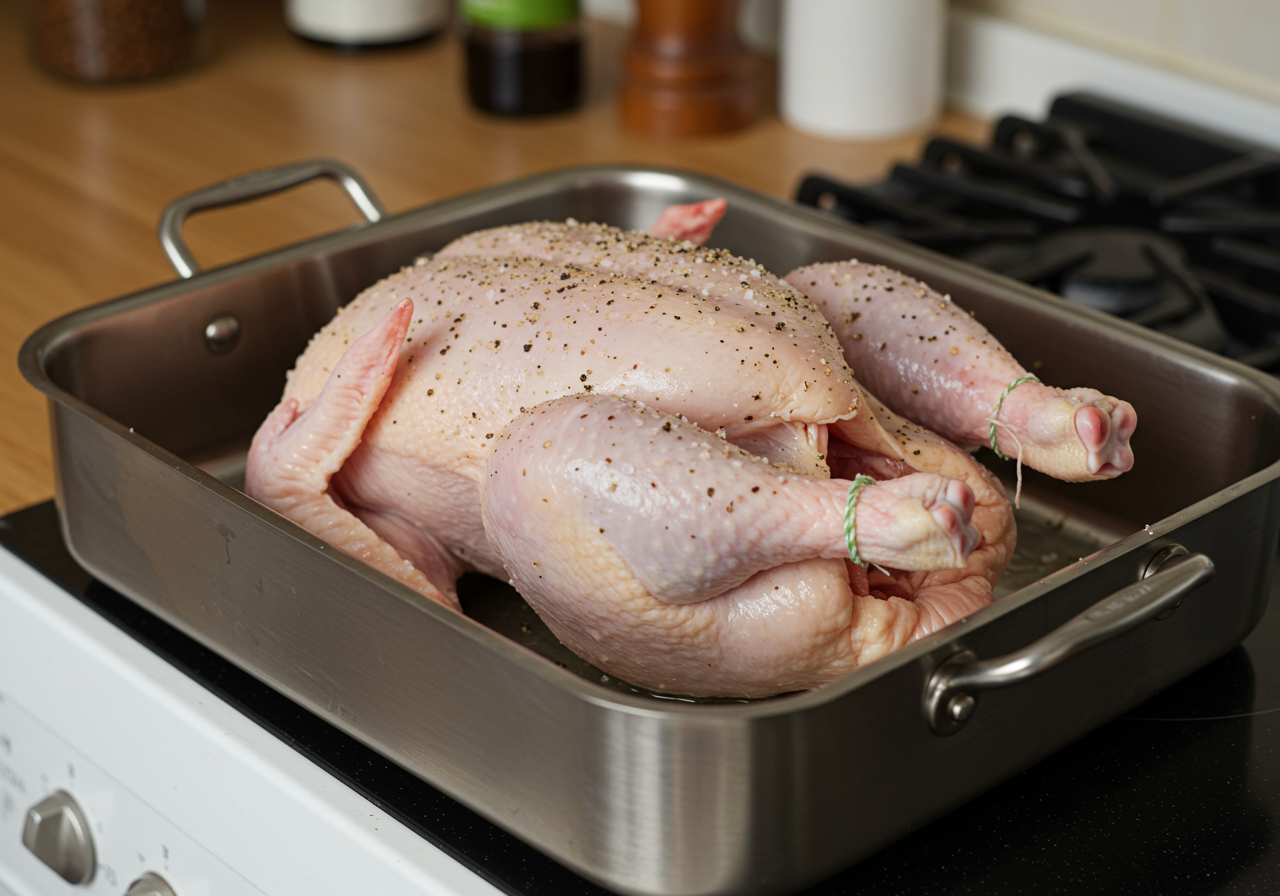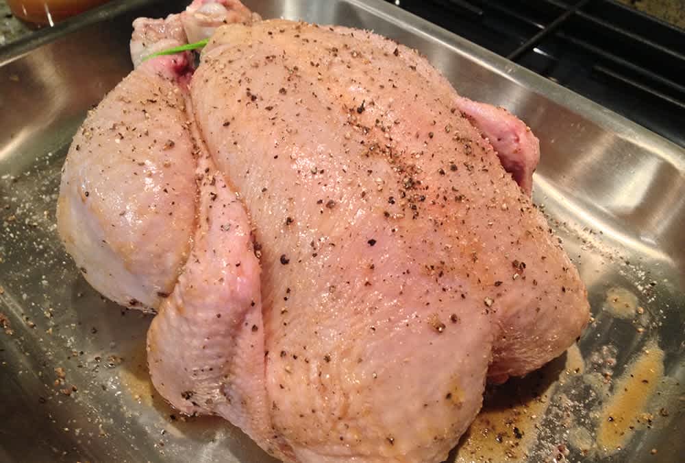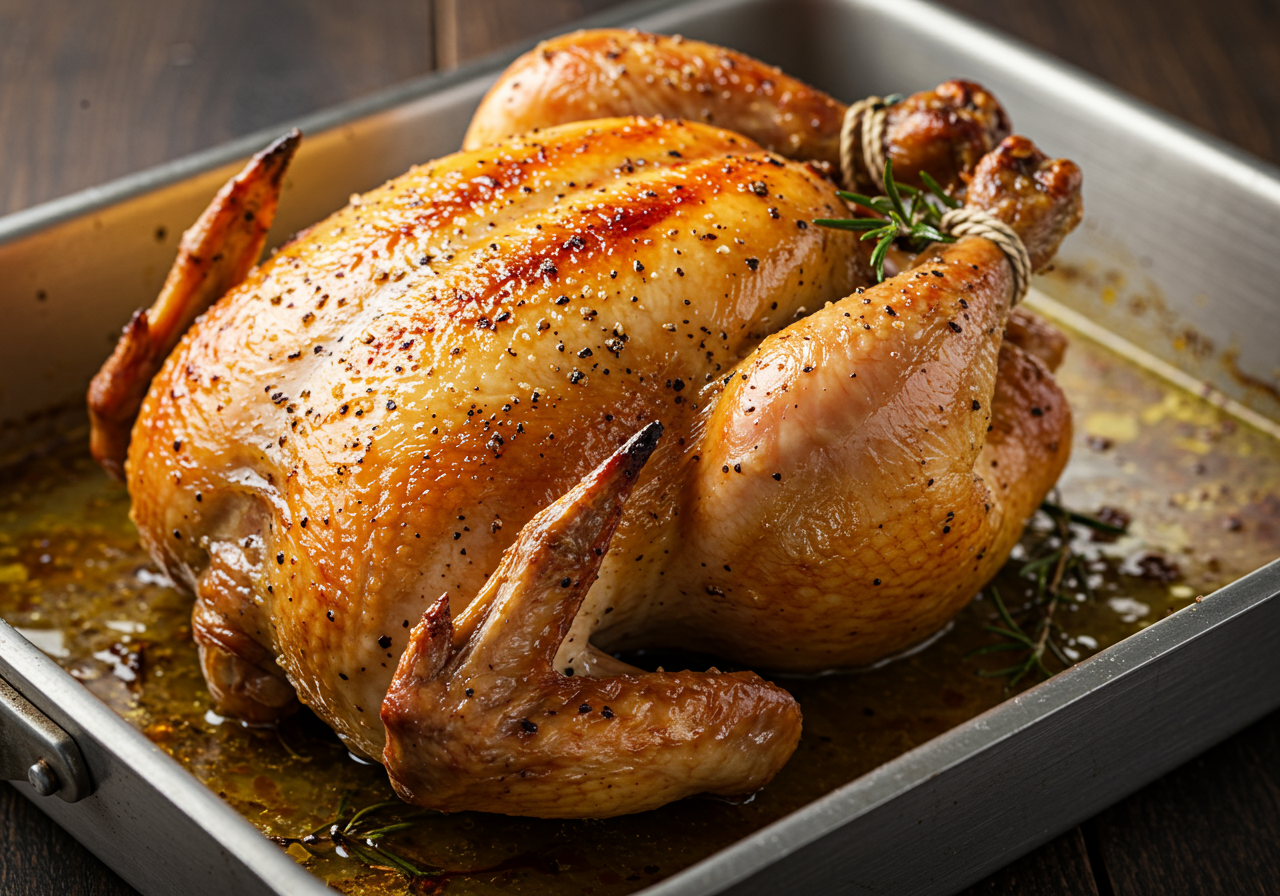 Season chicken with salt and pepper, stuff cavity with crushed garlic, and bunch thyme; tie legs together with kitchen twine. Transfer to a 9″ x 13″ baking dish.