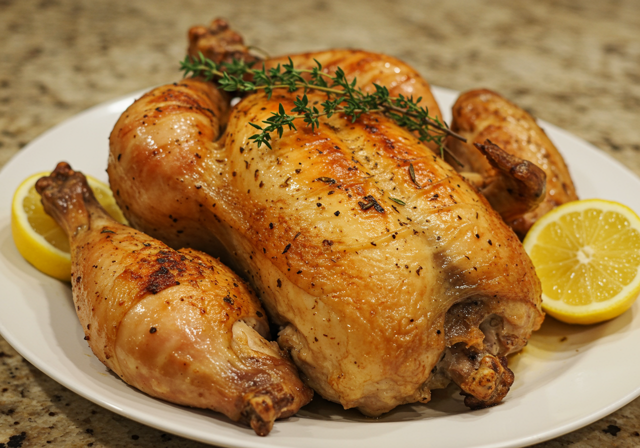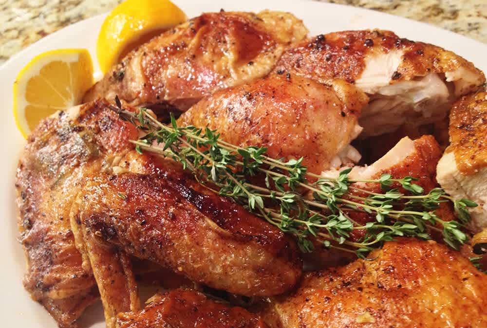 Carve, cut in half or into pieces, and serve with lemon wedges.