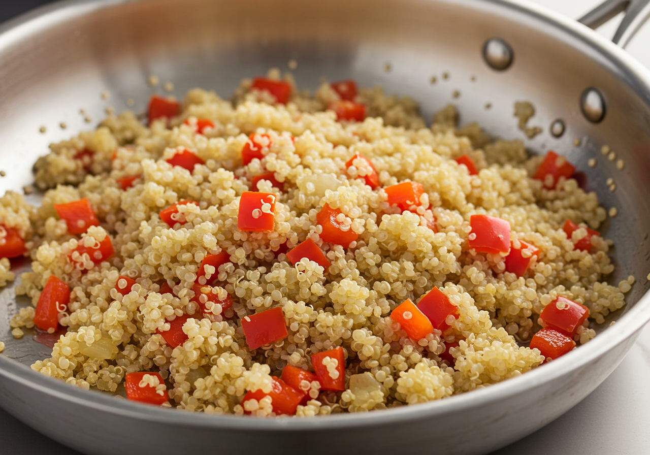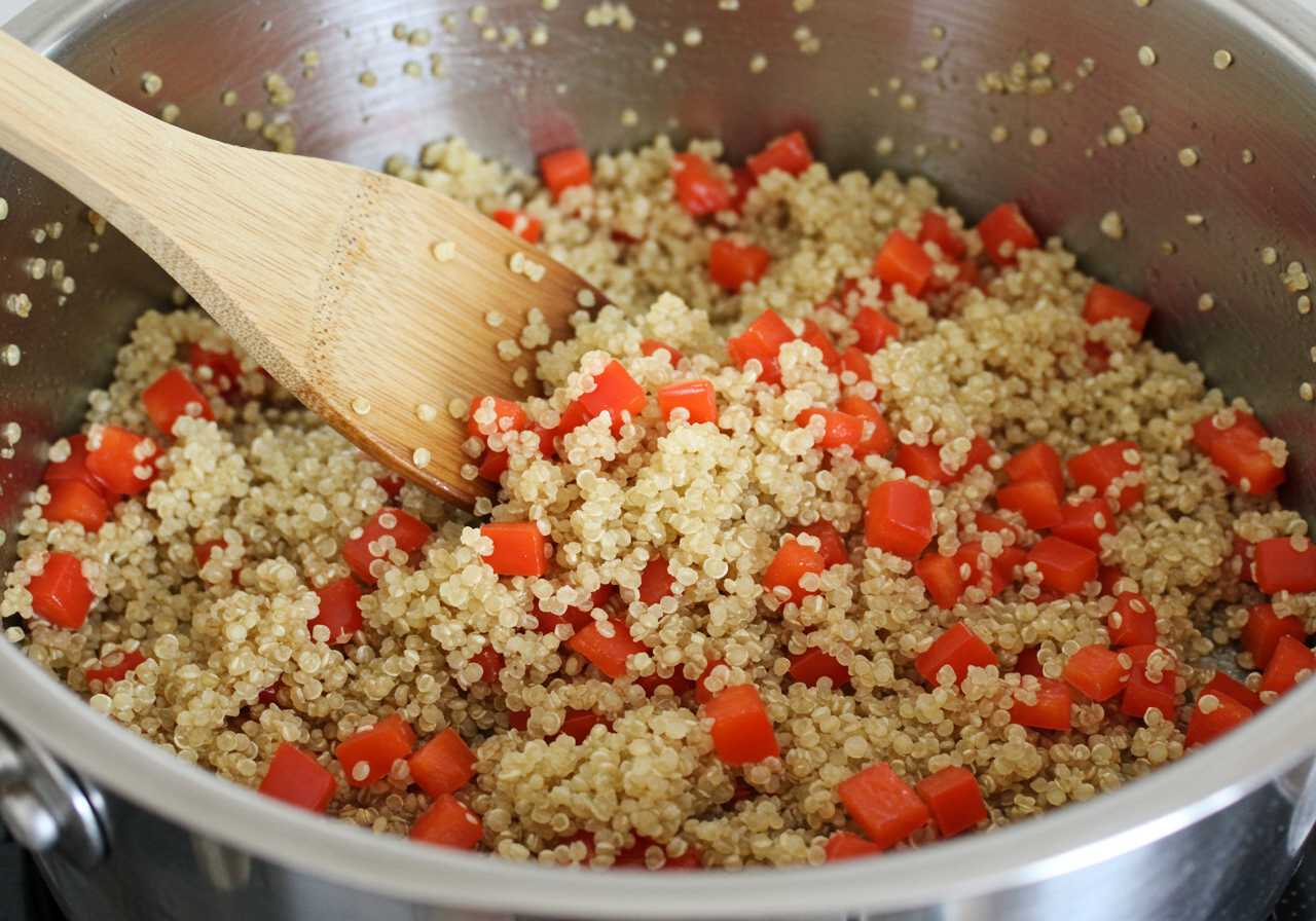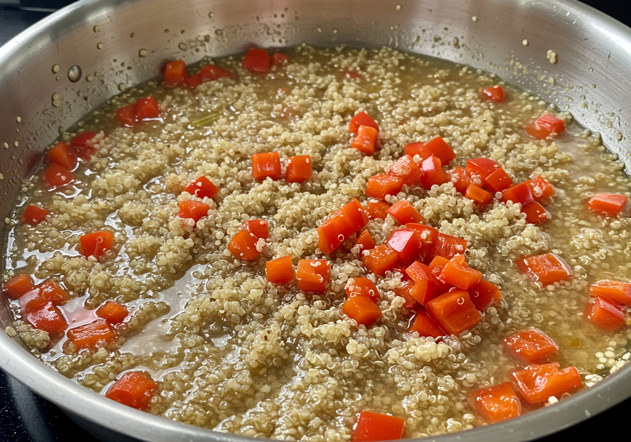Add the broth and bring to a boil. Cover the pan and simmer until all of the broth has been absorbed and the quinoa is tender, about 15 minutes.