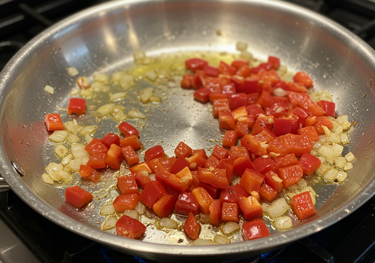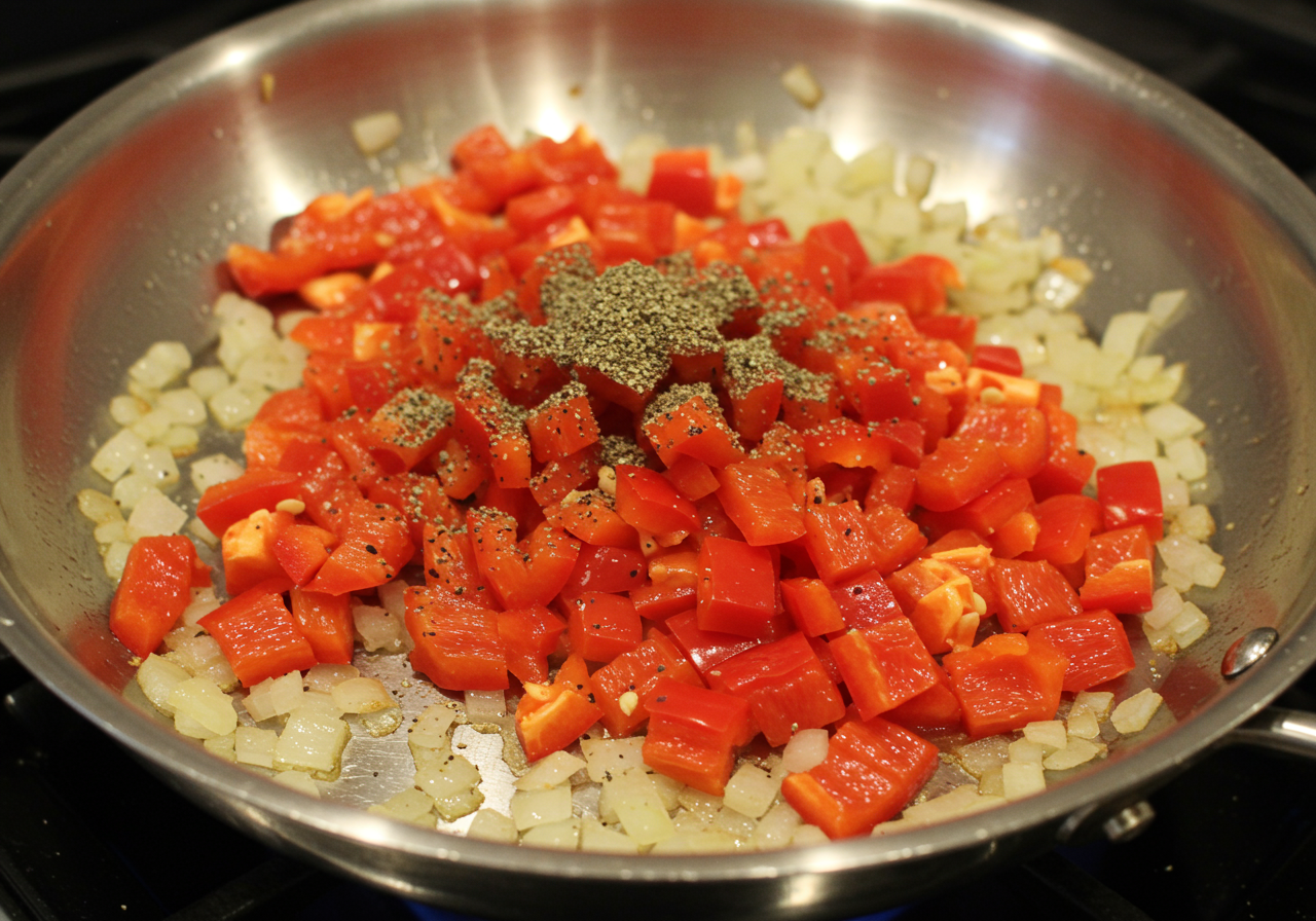 Add the bell pepper, salt, and pepper. Cook until the vegetables are tender, 5 minutes.