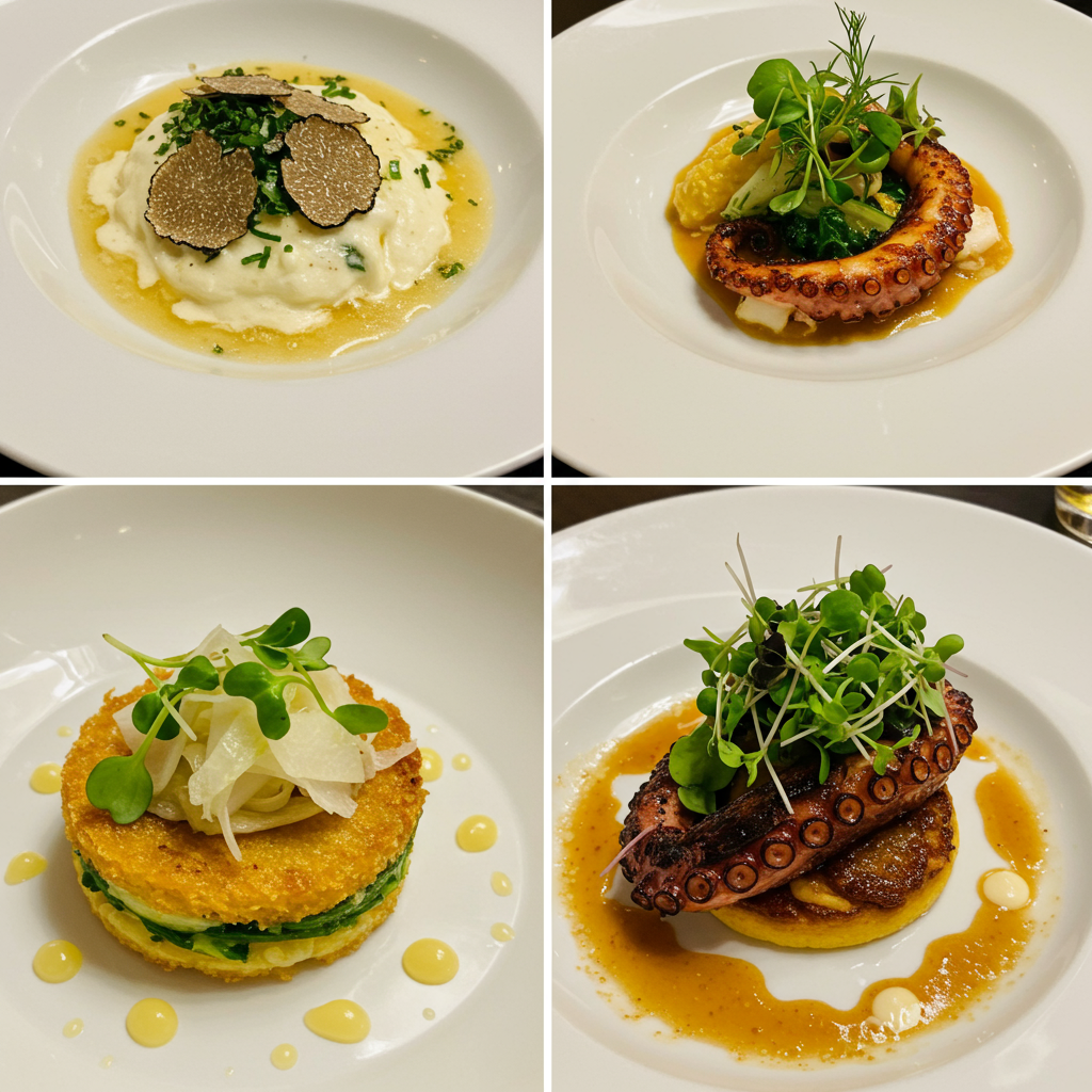 - Seared Mediterranean Octopus: risotto forma, sherry pan sauce.