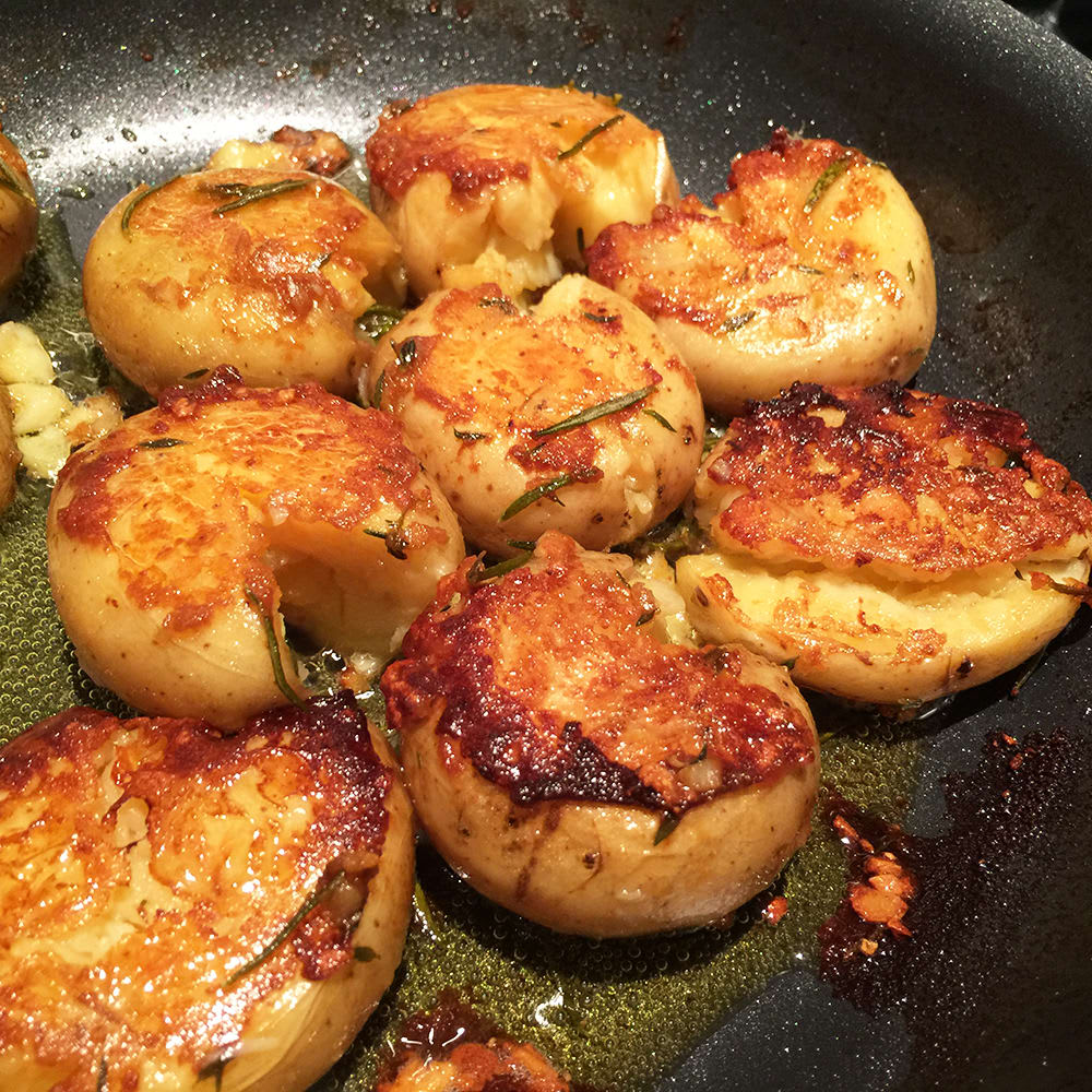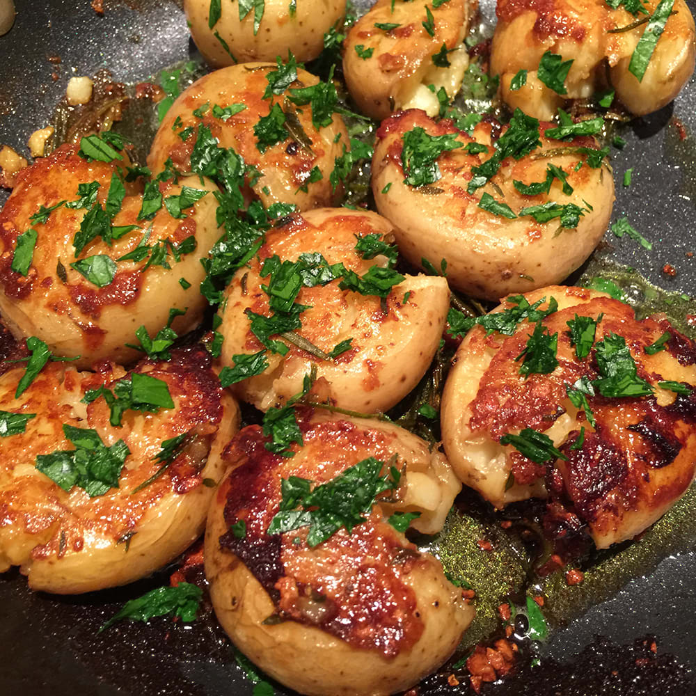 - Remove the potatoes from heat again, turn the potatoes, scrape up any burnt bits, and add the last tablespoon of butter to the pan. Press the other sides of the potatoes to crack and flatten them more if necessary. Sprinkle the potatoes with parsley or chives and cook until the other side is browned, about 5 minutes.