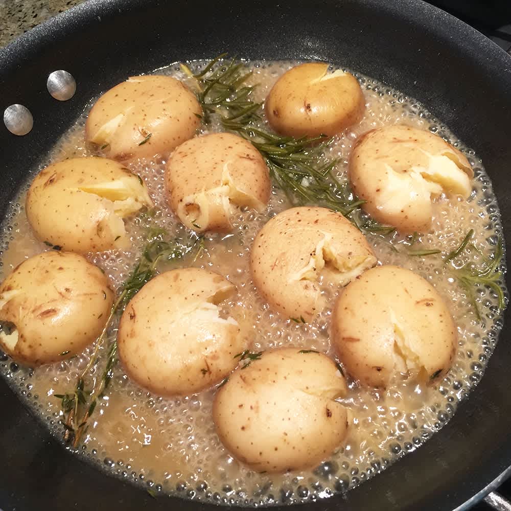 Remove the pan from the heat, remove and discard the herb sprigs and use a meat mallet, wooden spoon, or back of a measuring cup to gently press down on the tops of the potatoes until the skin cracks and they flatten out a bit.