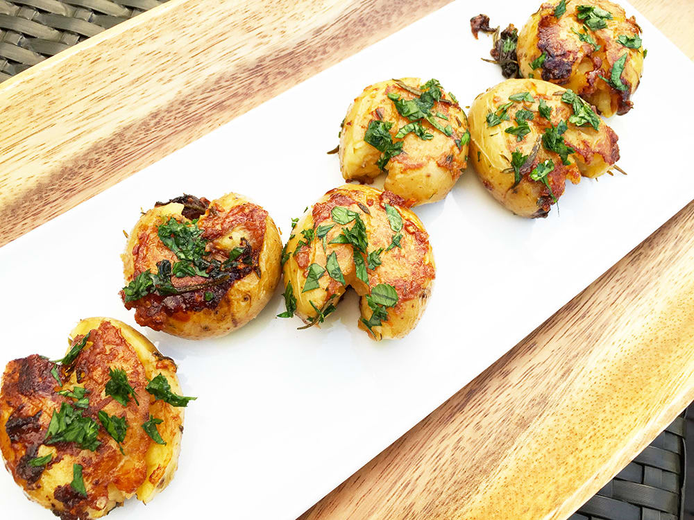- Remove the pan from the heat, remove and discard the herb sprigs and use a meat mallet, wooden spoon, or back of a measuring cup to gently press down on the tops of the potatoes until the skin cracks and they flatten out a bit.