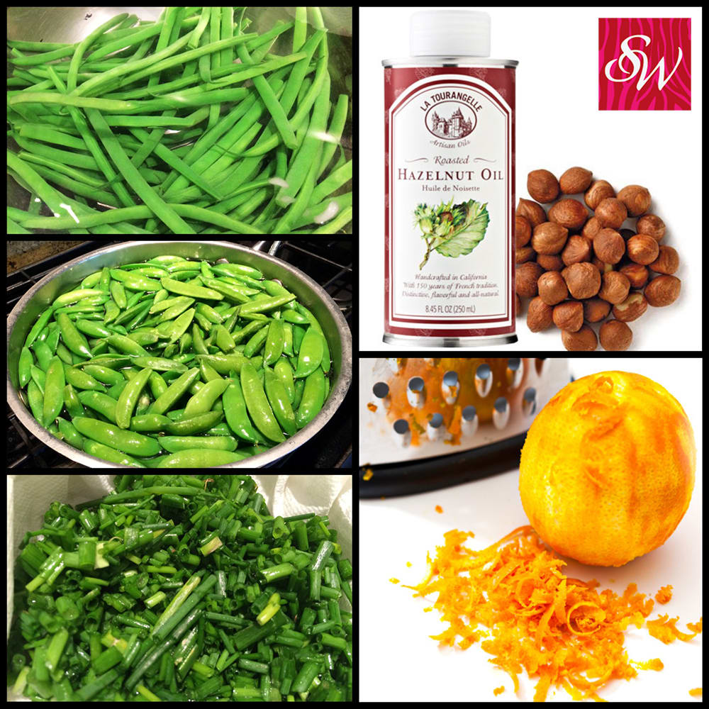 - While the hazelnuts are roasting, prepare the green beans by trimming off the ends with kitchen shears or a sharp knife. Snap peas require no prep, if using snow peas trim and remove stringy spines.