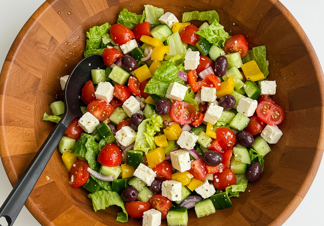 - Whisk together the garlic, oregano, mustard, vinegar, salt and pepper in a small bowl. Still whisking, slowly add the olive oil to make an emulsion. Pour the vinaigrette over the vegetables. Add the feta and olives and toss lightly. Set aside for 30 minutes to allow the flavors to blend. Just before serving, incorporate the lettuce, this will allow it to stay crisp. Serve at room temperature.