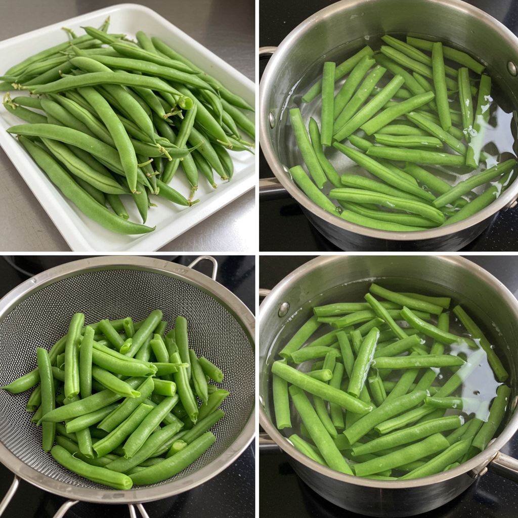 - Bring a large pot of water to a boil. Add the green beans and blanch them for 2 to 3 minutes, until tender but still crisp. Drain the beans in a colander and immediately put them into a bowl of ice water to stop the cooking and preserve their bright green color.