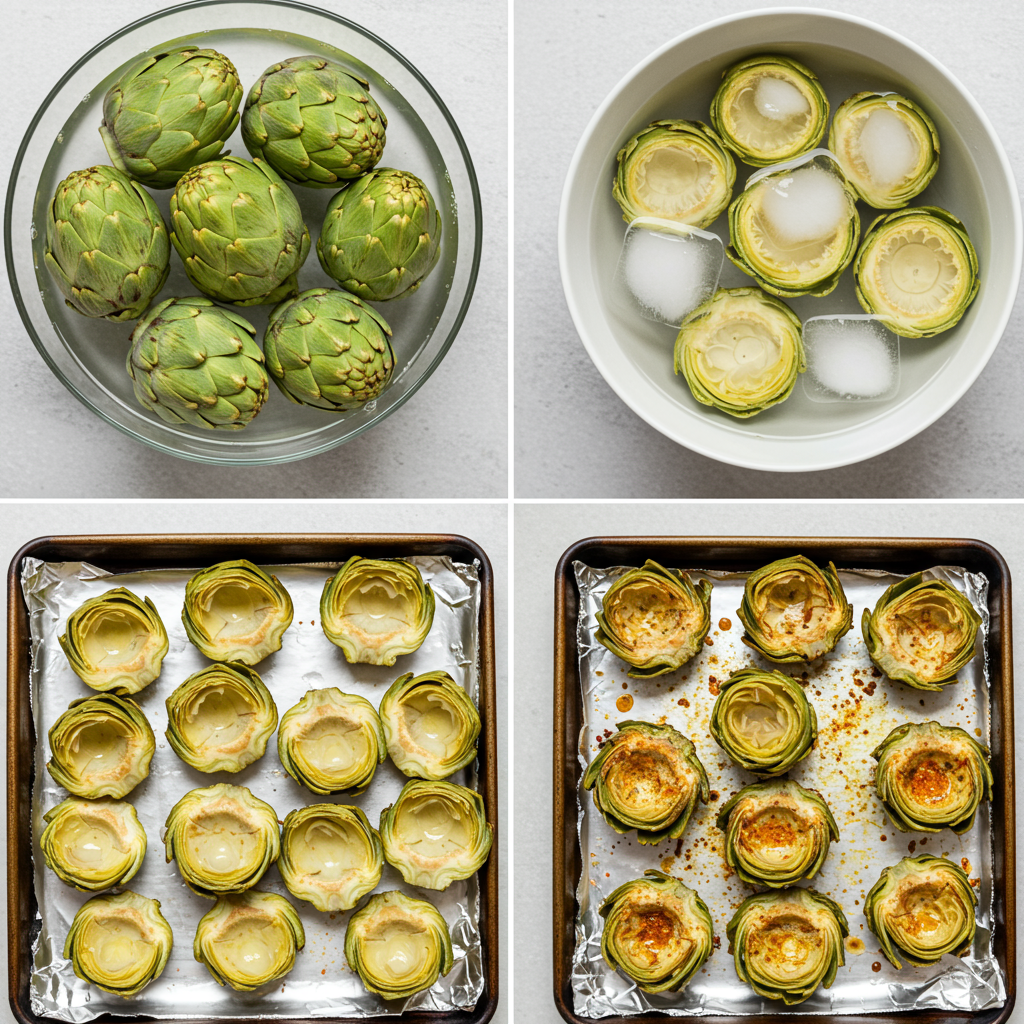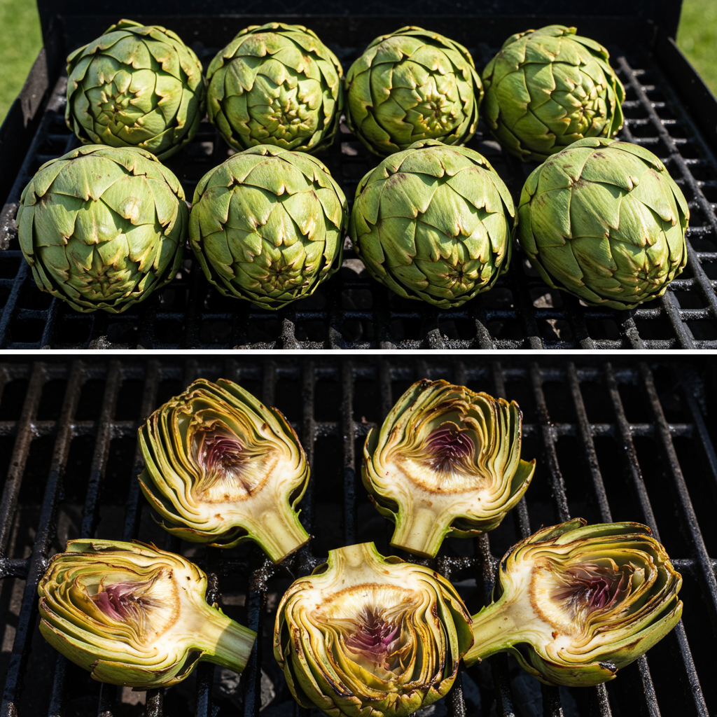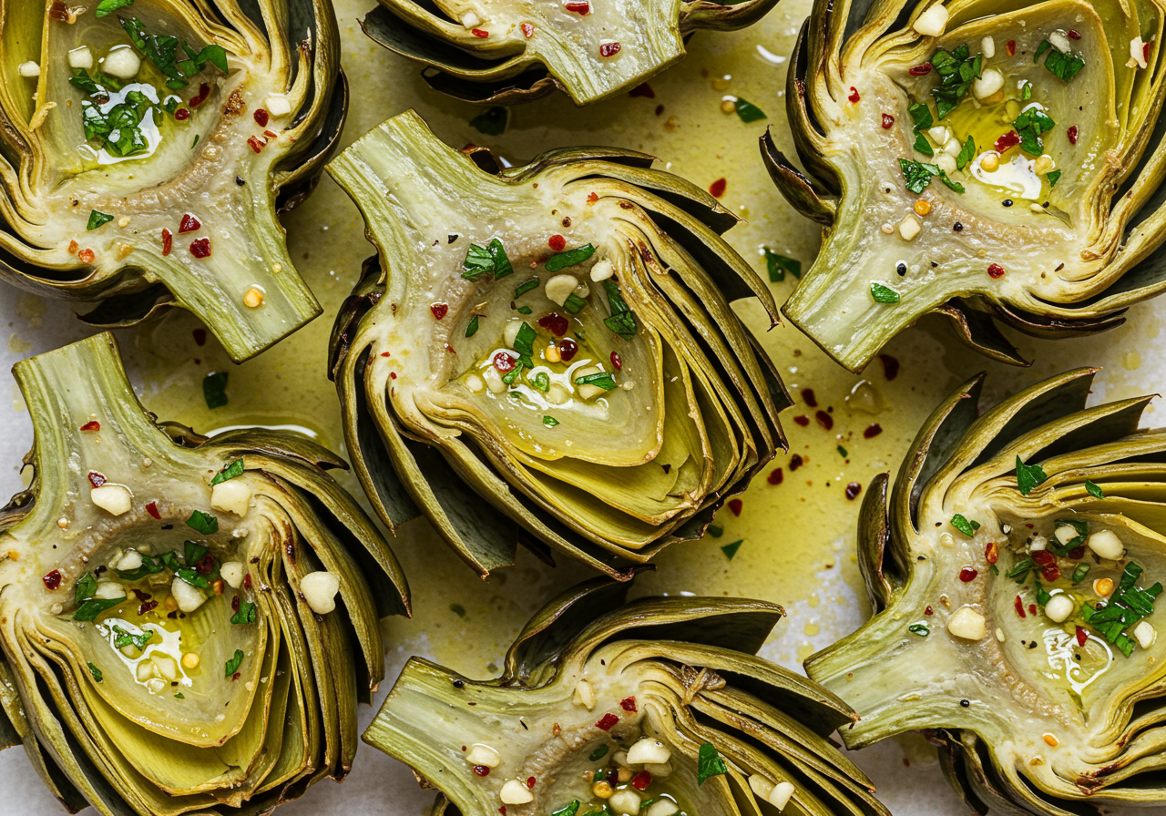 • When cool, brush both sides of each artichoke half with olive oil and sprinkle with salt and pepper.