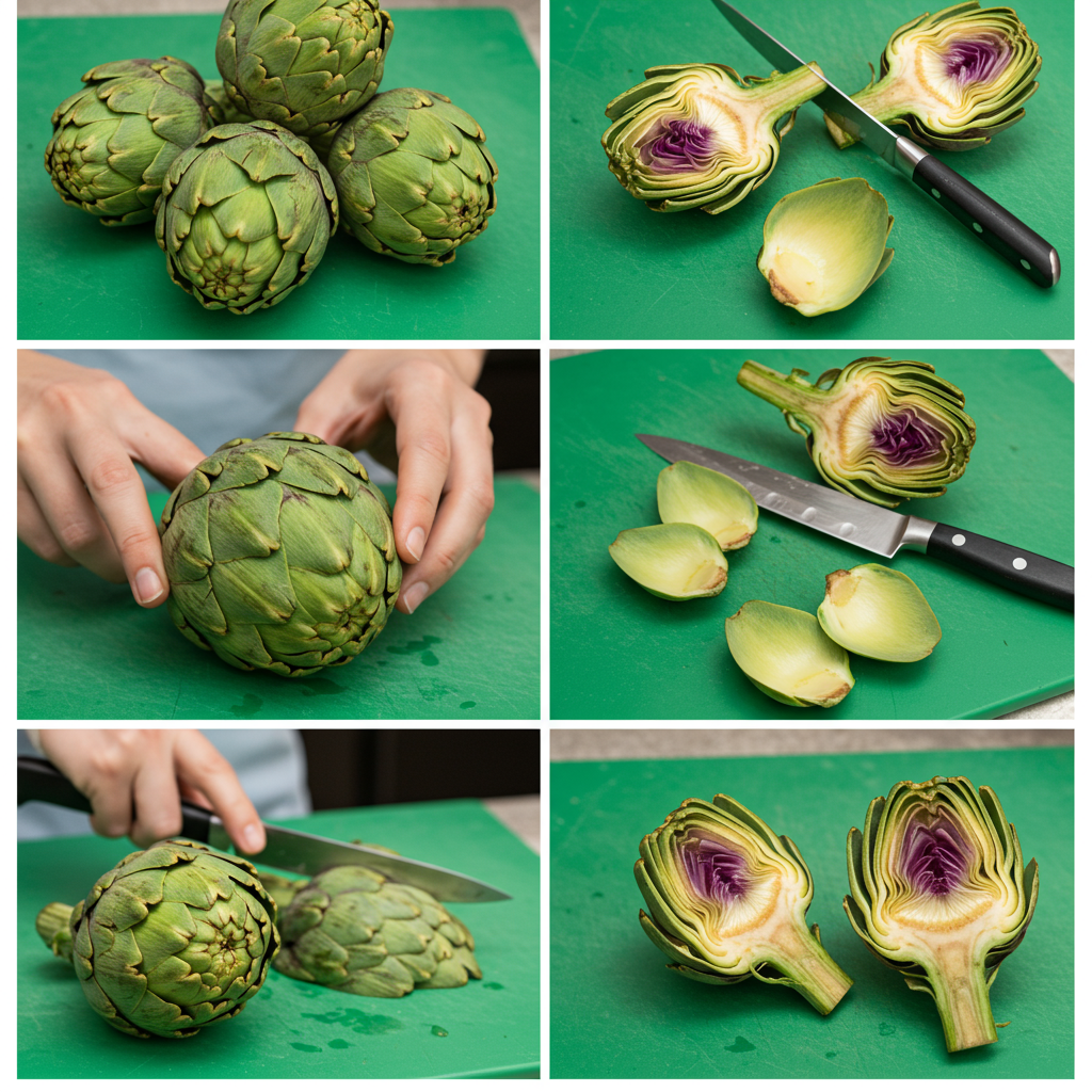 • Using a serrated-blade knife, cut off the spiky top third of a baby artichoke and discard the trimmings.