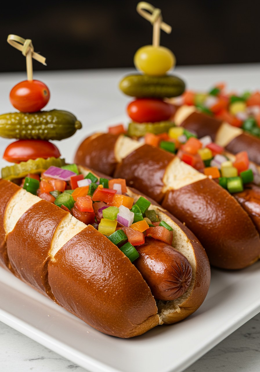 - Spread Jalapeño yellow mustard on one side of the bun and Ketchup on the other. Pile relish salad on the bottom bun, and top with a hot dog and top bun. Insert a long pick through a Cornichon and place it in the middle of each Heavenly Hot Dog and serve.