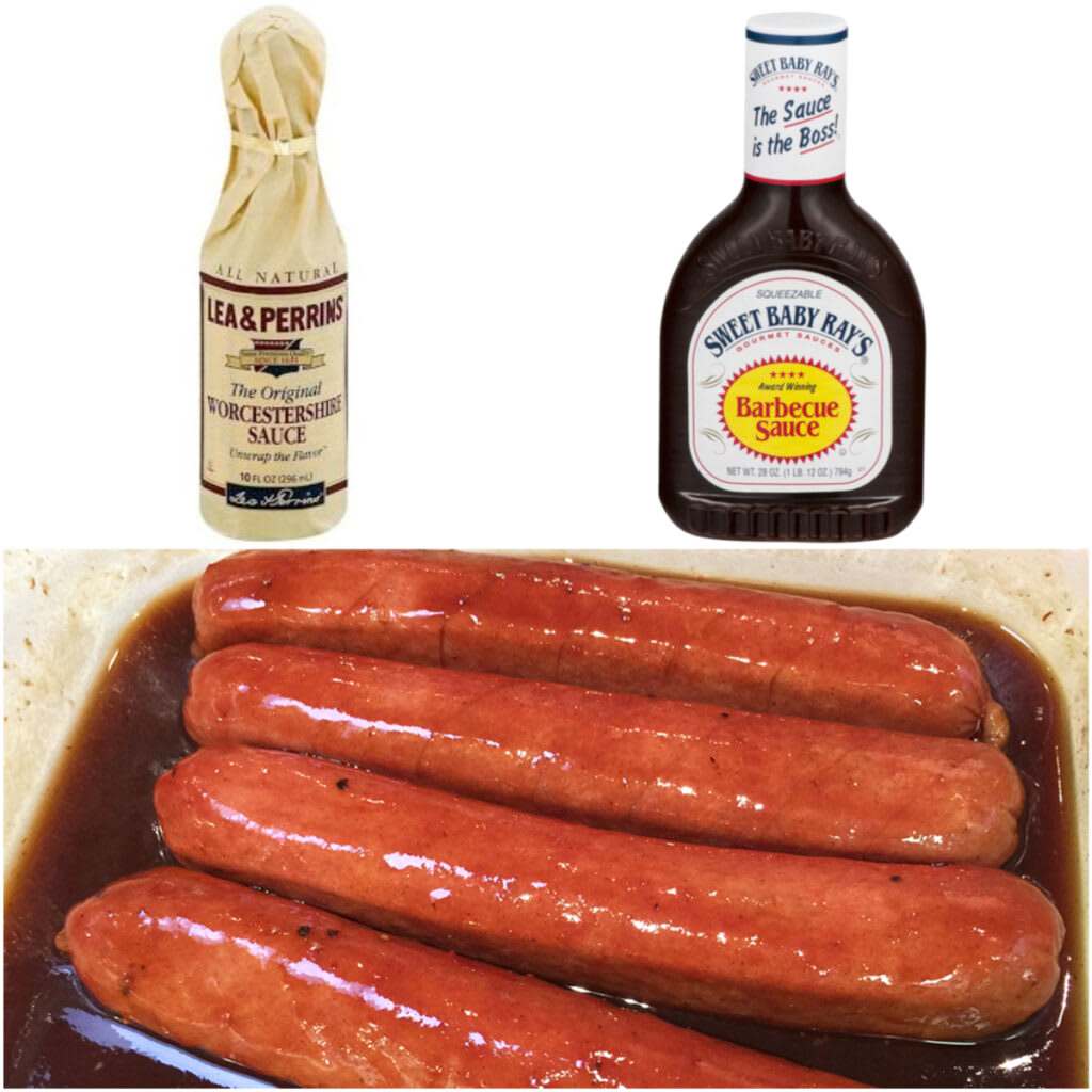 - Mix the barbecue and Worcestershire sauces and marinate the dogs for about 1/2 hour, longer if possible.