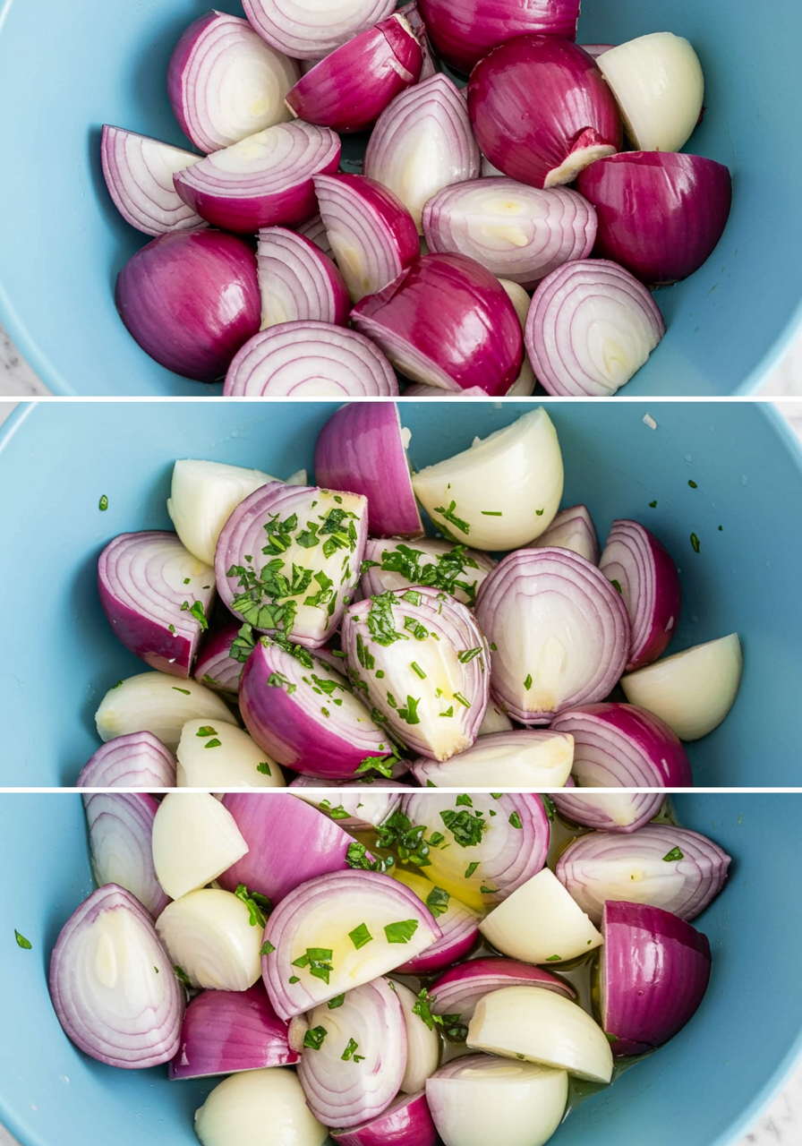 Remove the stem end of each onion and carefully slice off the brown part of the root end, leaving the root intact. Peel the onion. Stand each onion root end up on a cutting board and cut the onion in wedges through the root. Place the wedges in a bowl.
