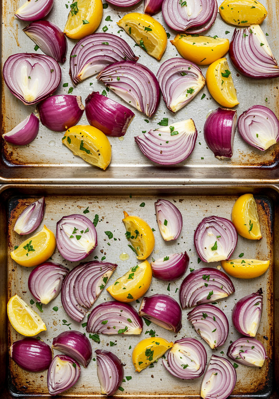 - With a slotted spoon, transfer the onions to a sheet pan, reserving the vinaigrette that remains in the bowl.