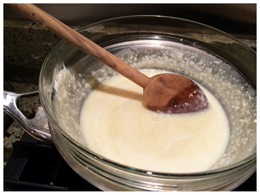 - Heat the cream, white-coconut chocolate and vanilla bean in a bowl over simmering water or double boiler until well incorporated and melted.