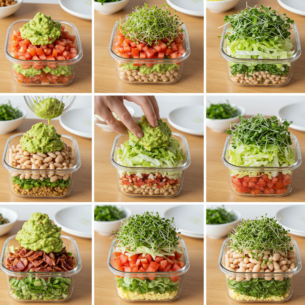 - Using square or round molds stack each salad atop individual plates by layering 1/4 cup of each ingredient. Start with the avocado, followed by tomatoes, beans, romaine, bacon and blue cheese. Salads can be pre-made to this point and refrigerated. Always start with the heavier ingredients at the bottom.