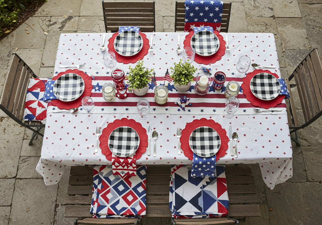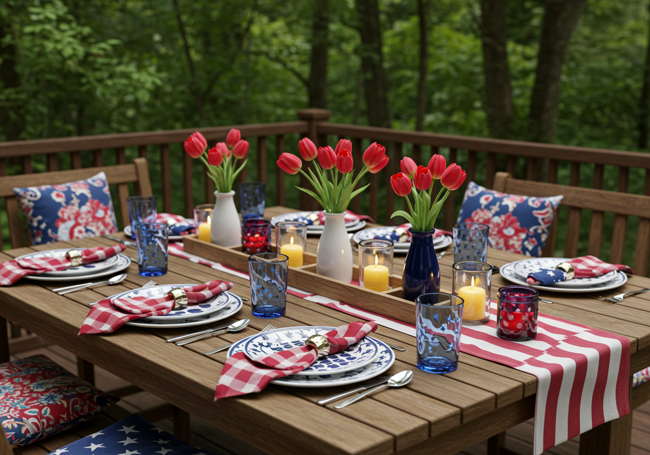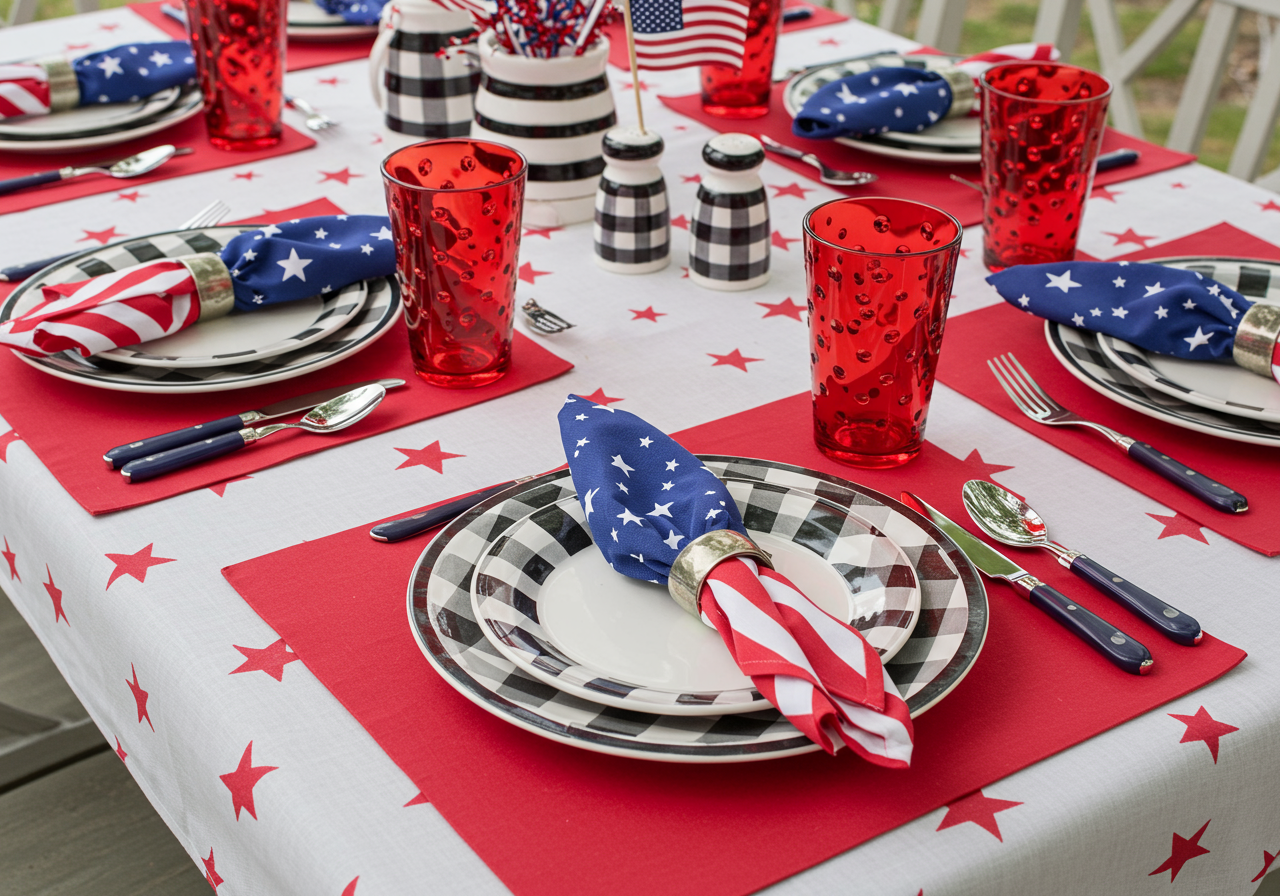 He makes everything super festive by creating tables with layers of red, white and blue.