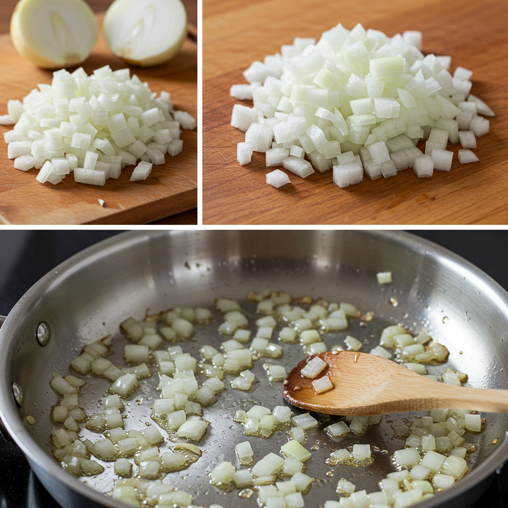 - Saute onion and garlic in olive oil, over medium heat, until soft.