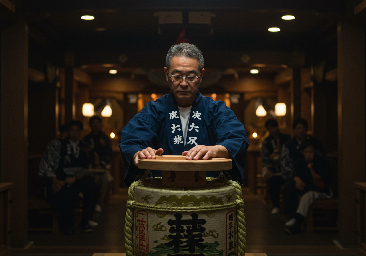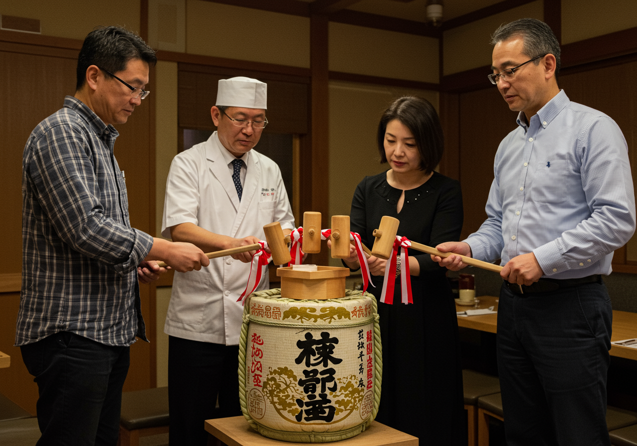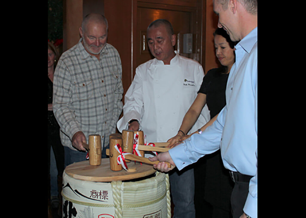 We gathered for a traditional celebratory Kagami-Biraki or sake barrel-breaking ceremony in which the lid of the Hokusetsu Saké barrel was broken open by a wooden mallet. Hazu then served his sake to everyone present. Kagami translates to, the lid of the sake barrel and Biraki means, to open. The round lid of the barrel symbolizes harmony. The Kagami-Biraki represents an opening to harmony and good fortune.
