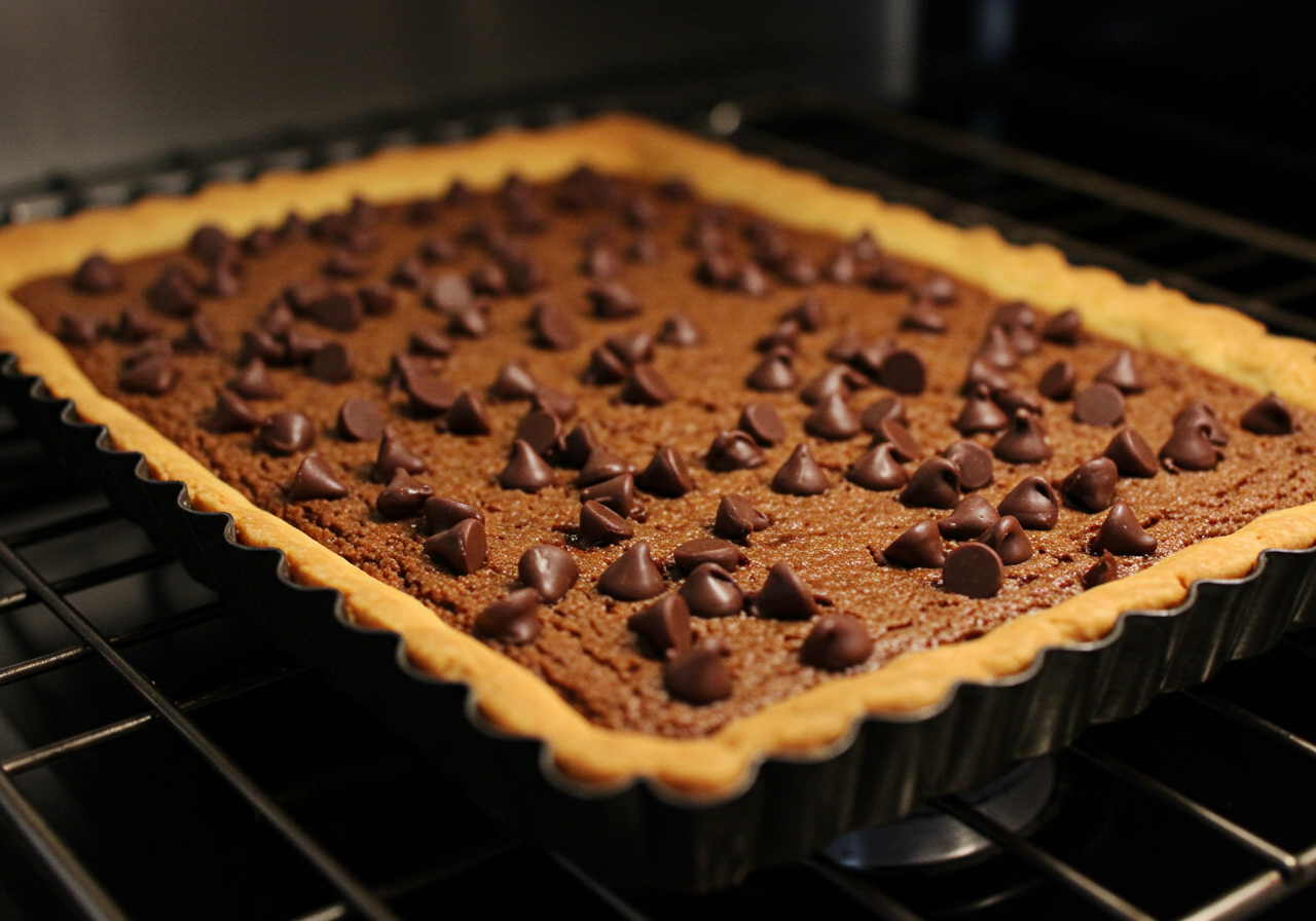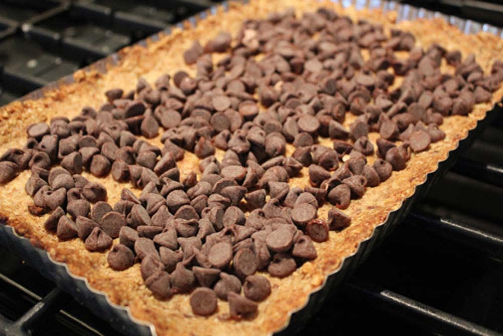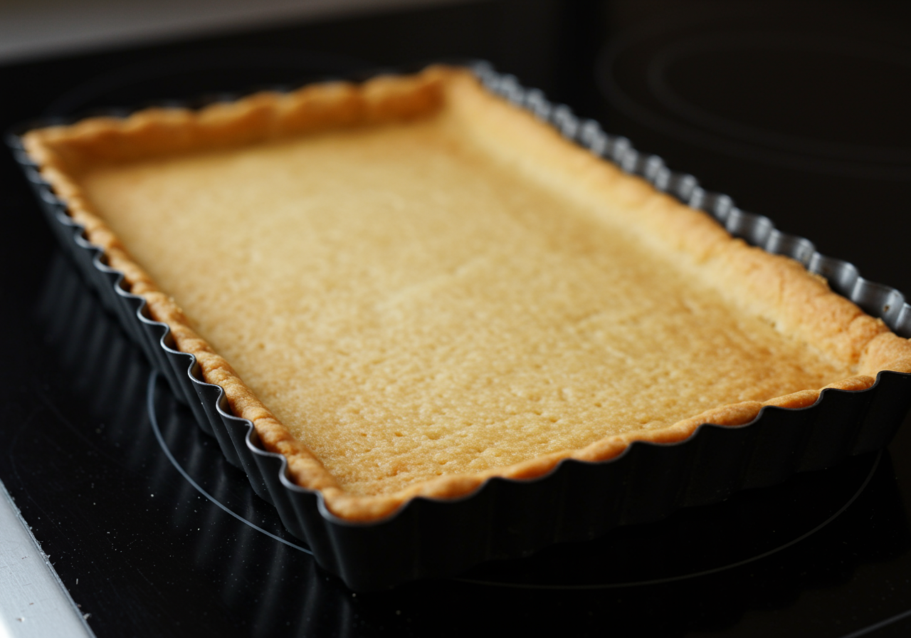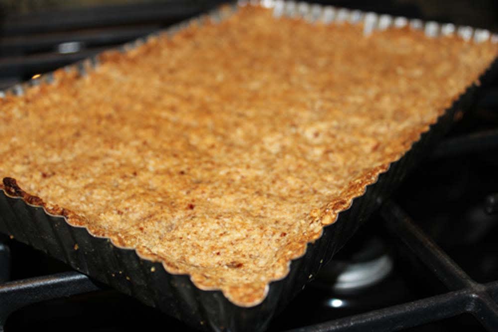 Pour mixture into a 9″ or 12″ x 4″ tart pan and press evenly up along the sides and the bottom. Bake at 350 degrees for 10–12 minutes.