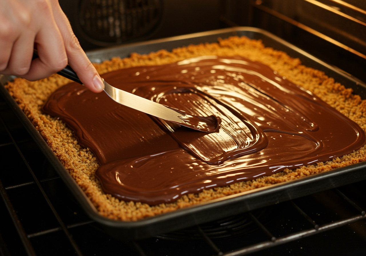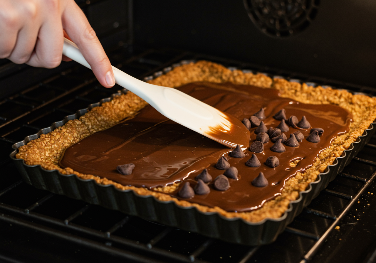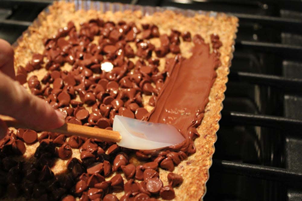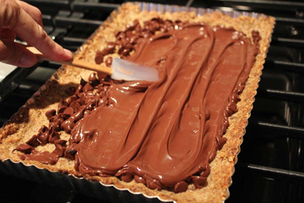 As they melt with the heat of the tart, take a spatula and spread an even coat on the crust.