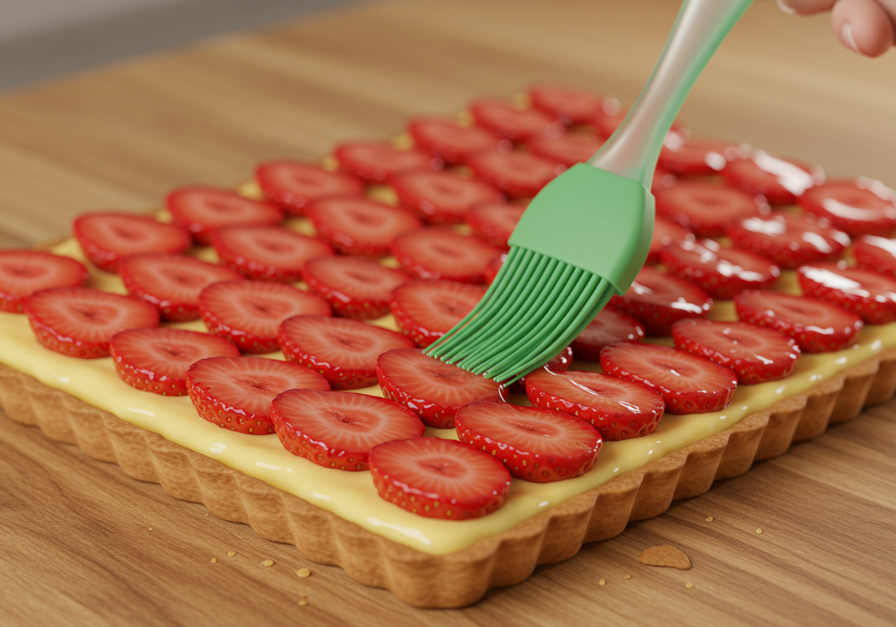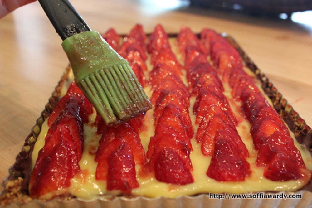 While still warm, using a pastry brush, spread the jelly mixture over the strawberries and curd until evenly covered.