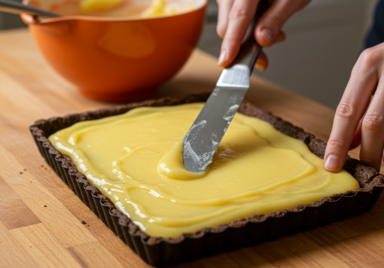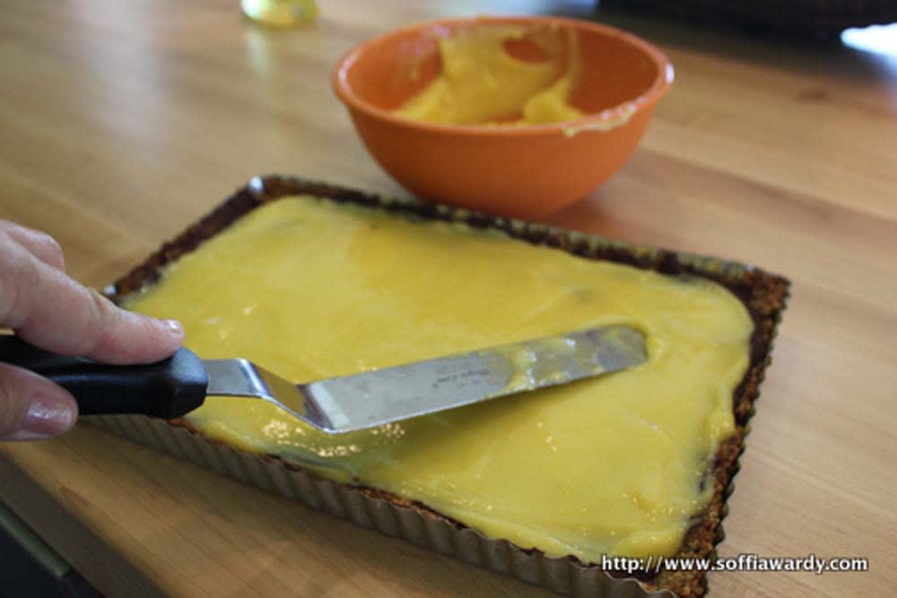 When crust and chocolate are cold, add a layer of lemon curd and spread evenly.