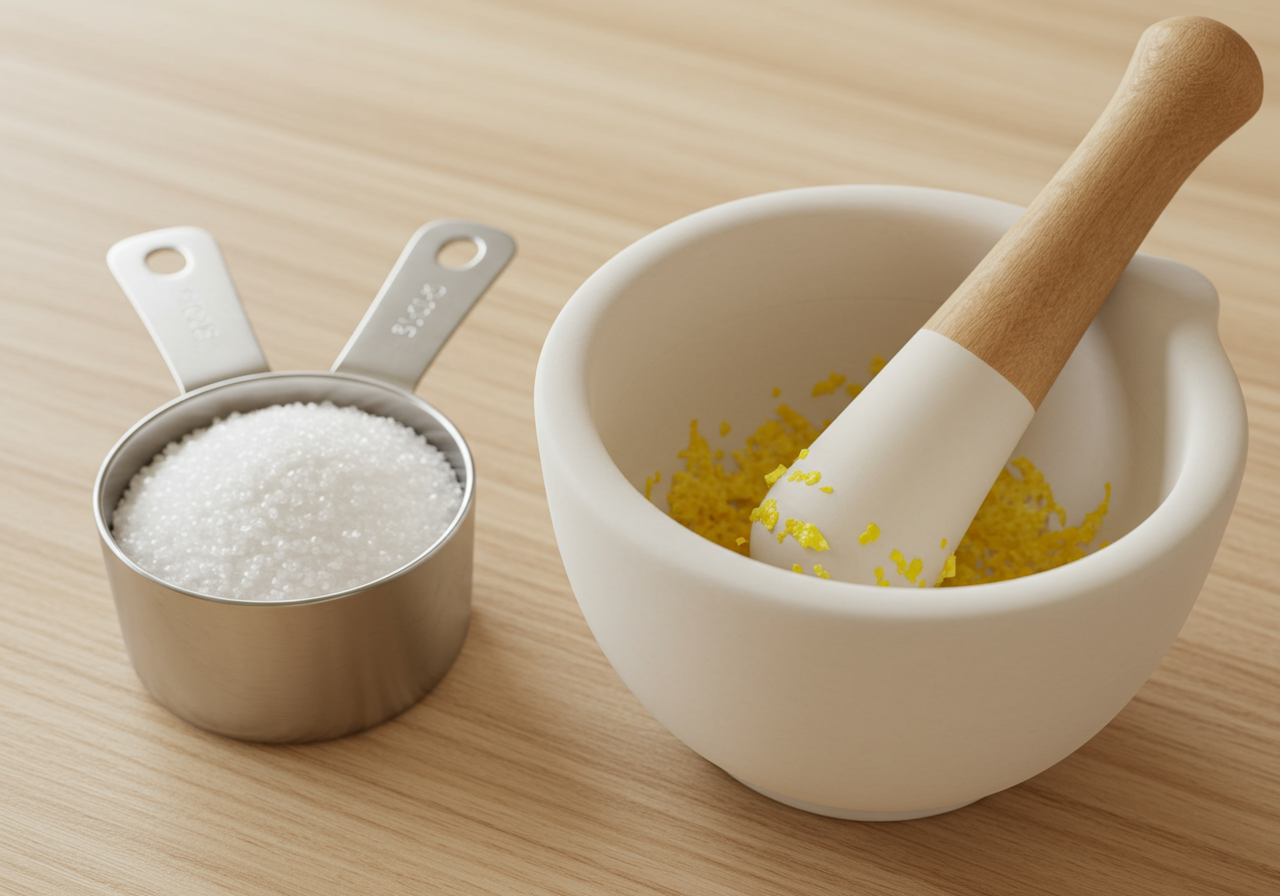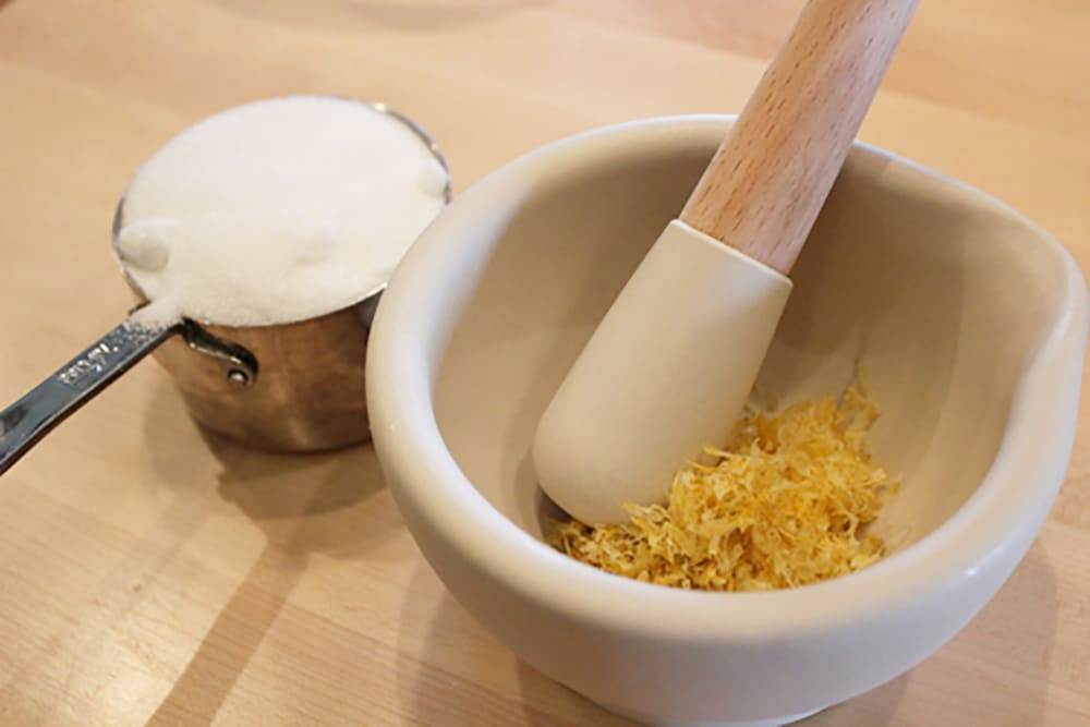Place Sugar and Lemon zest in a mortar and grind with the pestle to combine and release the oils.